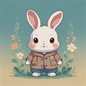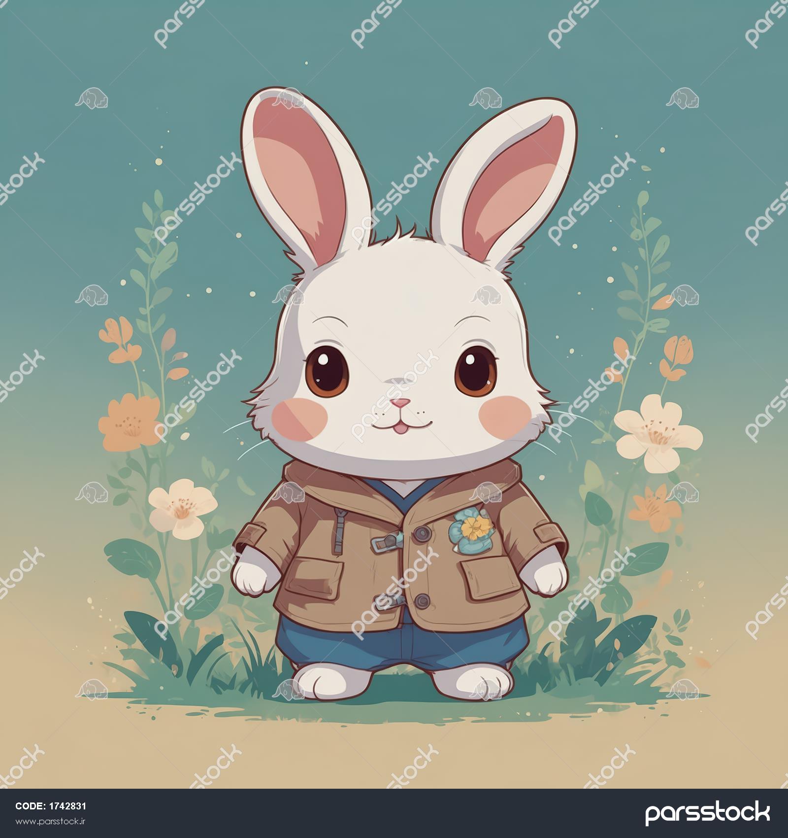 وکتور خرگوش بامزه کت قهوه‌ای پوشیده در حال ایستادن میان گل‌ها (پاییز)