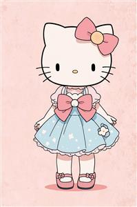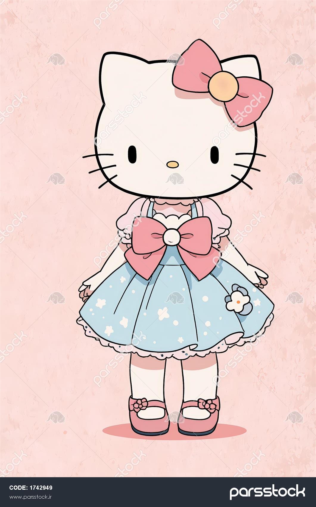 طرح دکوراتیو هلو کیتی با پاپیون بزرگ روی لباس آبی پاستلی و کفش صورتی