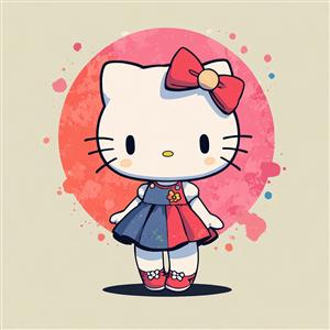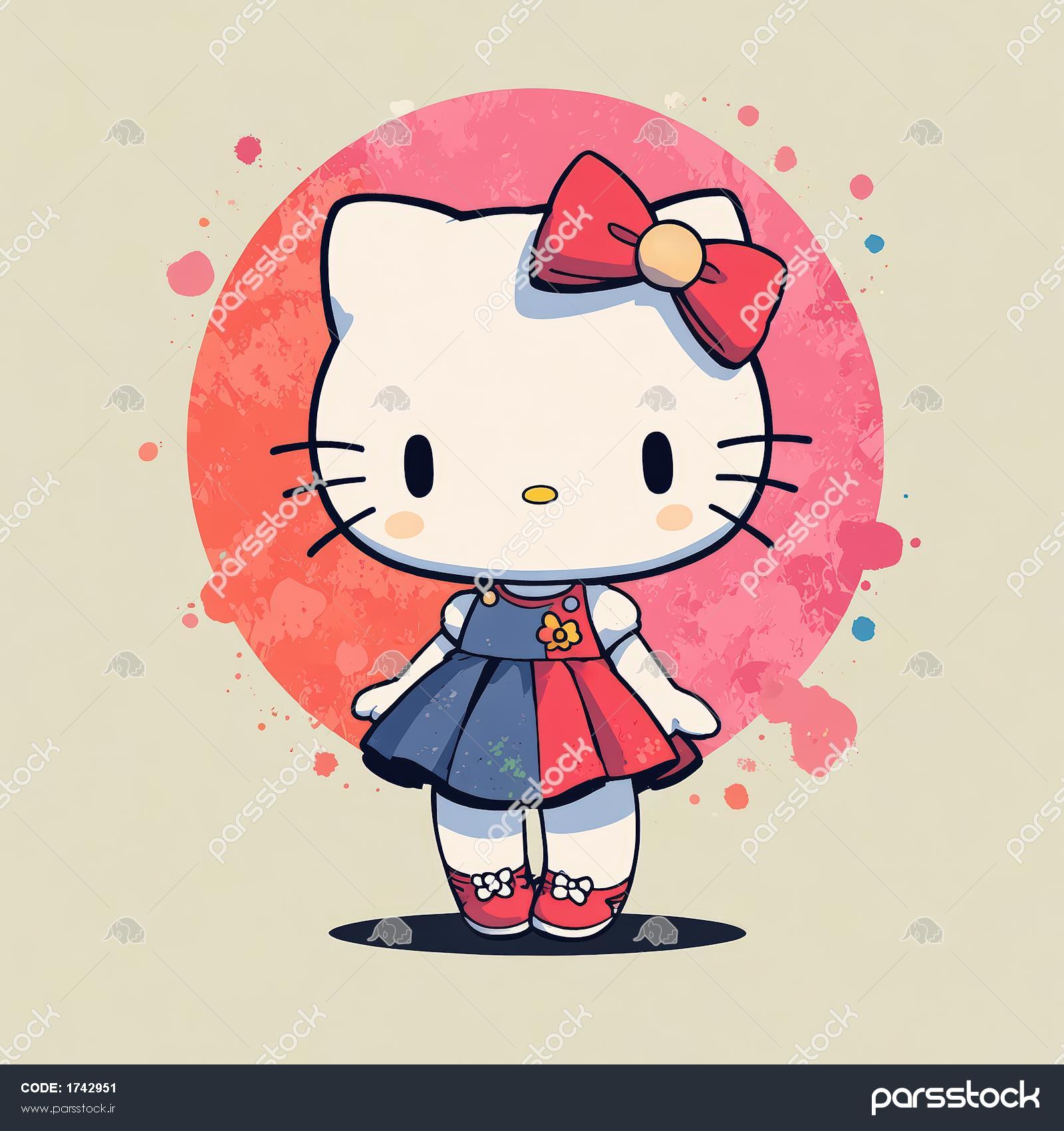پوستر هلو کیتی با لباس فانتزی دو رنگ قرمز و آبی روی بک‌گراند آبرنگی شاد