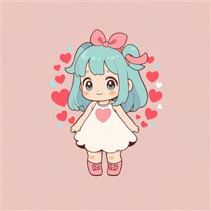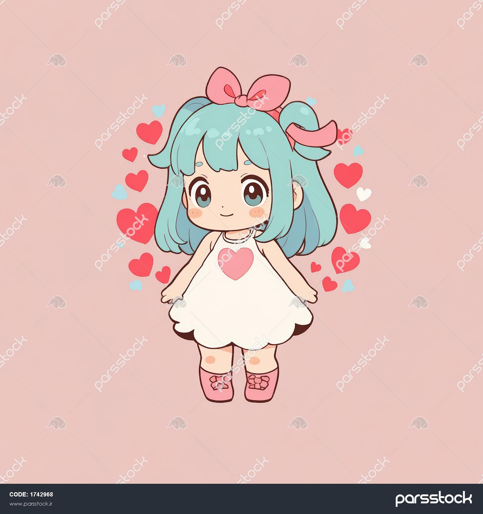 طرح فانتزی دختر چیبی در حلقه قلب با موی آبی و لباس سفید