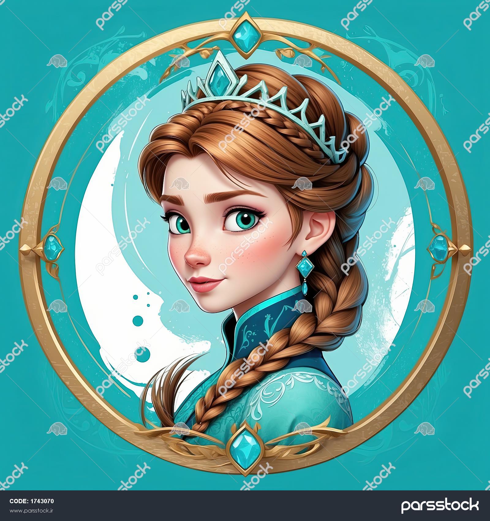 طرح پرتره آنا با تاج نقره‌ای و قاب طلایی فیروزه‌ای، عکس دکوراتیو با کیفیت بالا