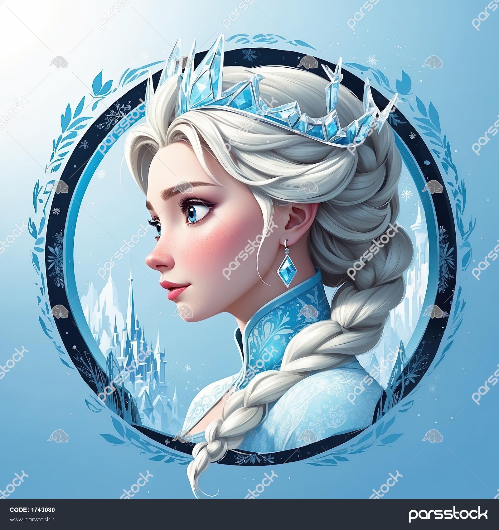 پرتره نیمرخ السا با پس‌زمینه قلعه یخی در قاب دایره‌ای، تصویر باکیفیت برای تابلو
