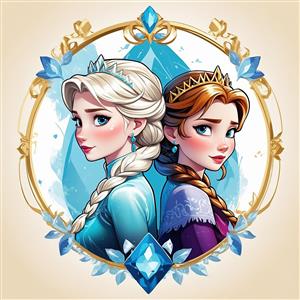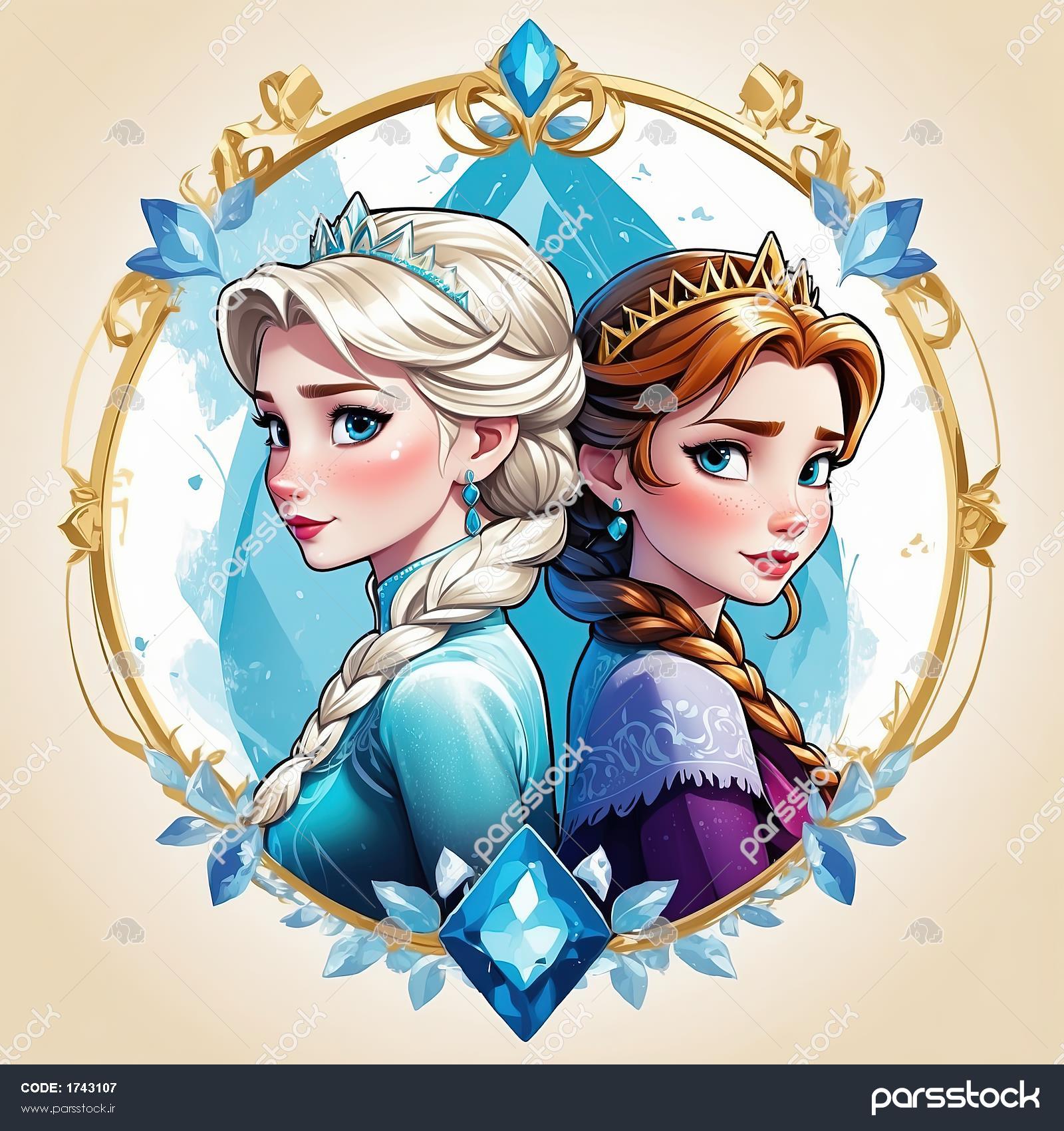 پرتره پشت به پشت السا و آنا در قاب طلایی با الماس مرکزی، طرح ویژه چاپ دکوراتیو فروزن