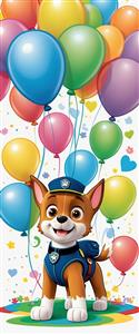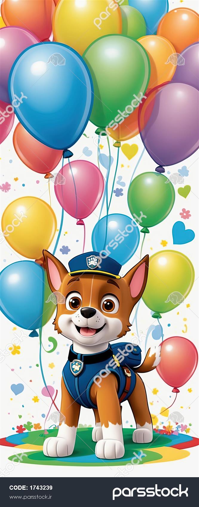 تصویر عمودی سگ قهرمان چیس با بادکنک‌های رنگارنگ و پس‌زمینه سفید جشن