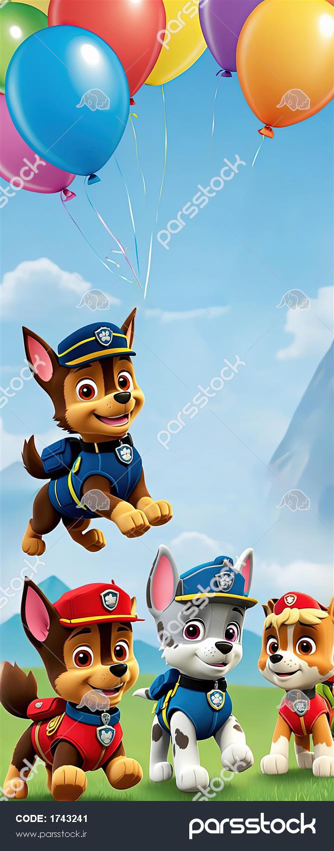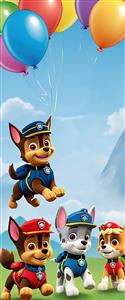 عکس باکیفیت چیس، مارشال و راکی پاو پاترول در چمنزار زیر بادکنک‌ها
