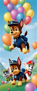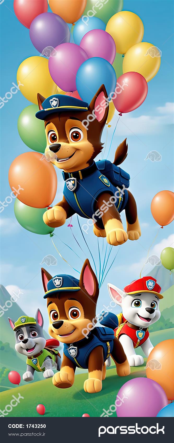 طرح دکوراتیو چیس و دوستان در حال پرش زیر بادکنک‌های پروازی در فضای باز