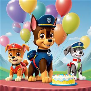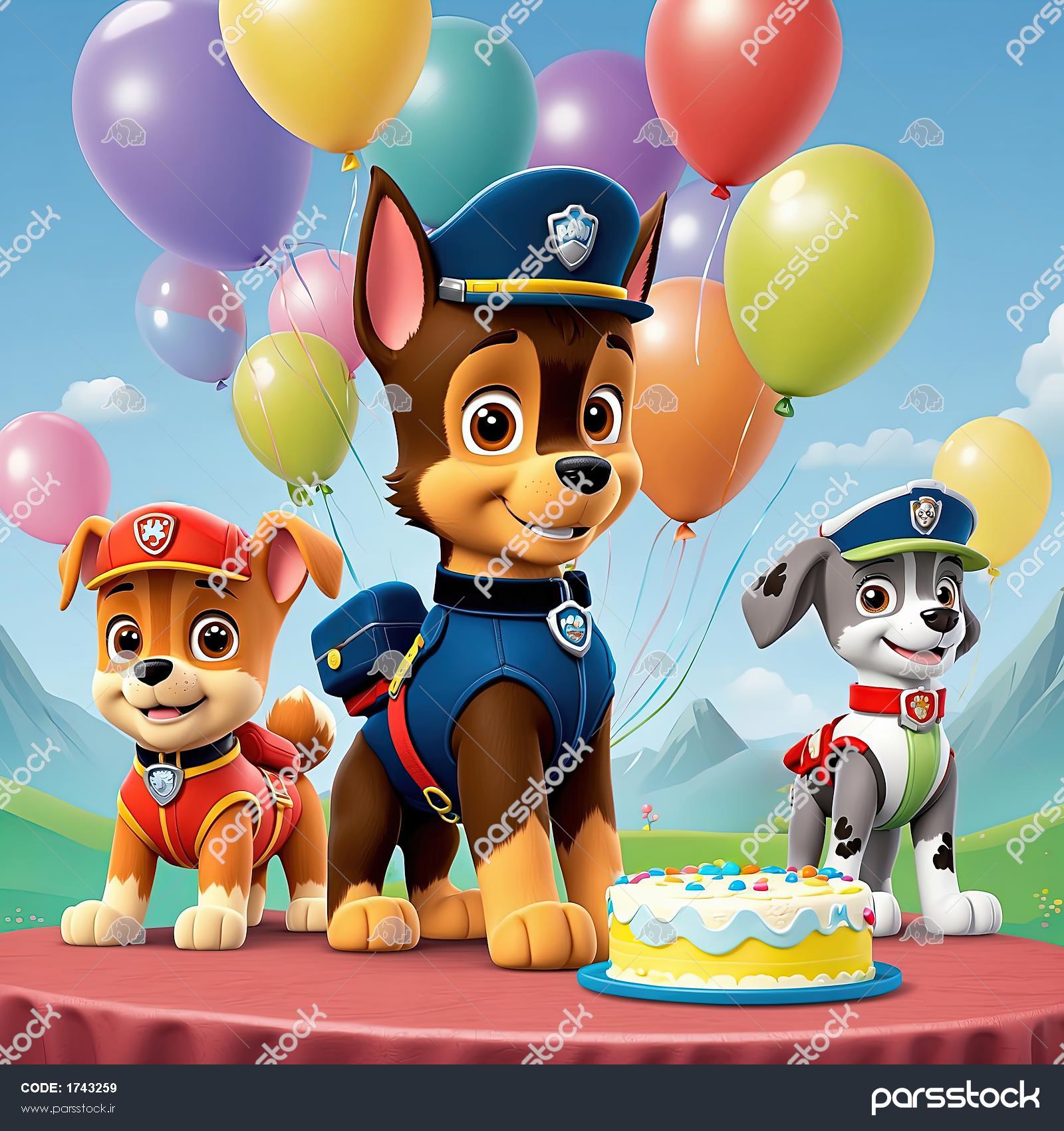 پوستر شلوغ سگ‌های پاو پاترول در محیط باز با بادکنک‌های بسیار زیاد و گل