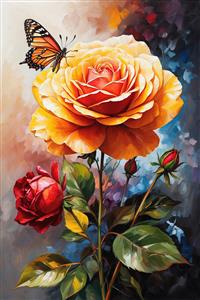 تابلو رز زرد و قرمز با قلم‌زنی ضخیم و پروانه، طرح دیواری مدرن