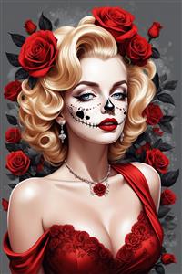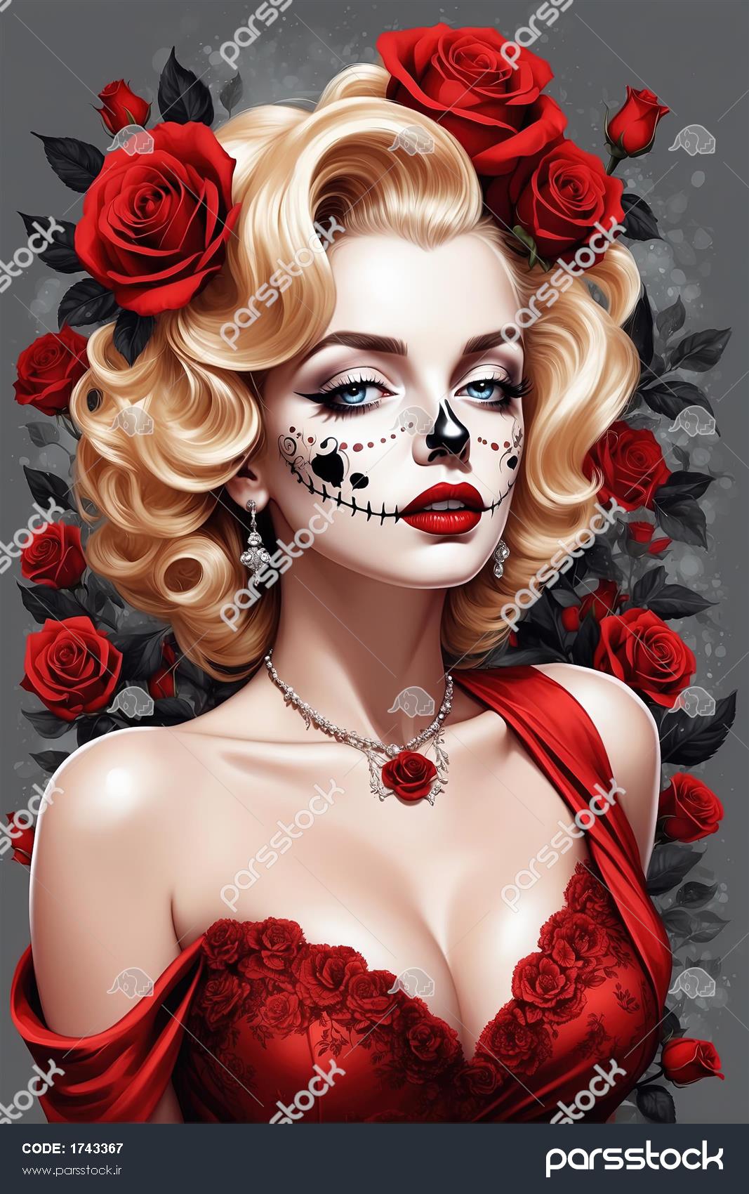 مرلین مونرو اسکلتی کامل در لباس قرمز باز با قفسه سینه استخوانی و جمجمه پرتره مرلین مونرو با موهای نقرهای، لباس قرمز روستیک و تاتوی استخوانی مرلین مونرو اسکلتی (کاترینا) با لباس قرمز و زمینه رزهای تیره پوستر مرلین مونرو با لباس شب قرمز، اسکلت و رز در طاق رومی مرلین مونرو کاترینا در لباس دامندار قرمز و حاشیه قوسدار رزهای رمانتیک تصویر لوکس مرلین مونرو با لباس طلایی و آرایش زیبا در میان رزها مرلین مونرو طلایی با لباس فاخر و حاشیه رزهای قرمز مخملی و برگهای تیره مرلین مونرو عاشق در لباس قرمز توری با تاتوی قلب برجسته و رزهای طلایی پرتره زن با کلاه پر و گل رز قرمز، لباس شب شیک پرتره شاهدخت شاهزاده با لباس شیک و آرایش لاکچری با گل های زیبا نمایش همه