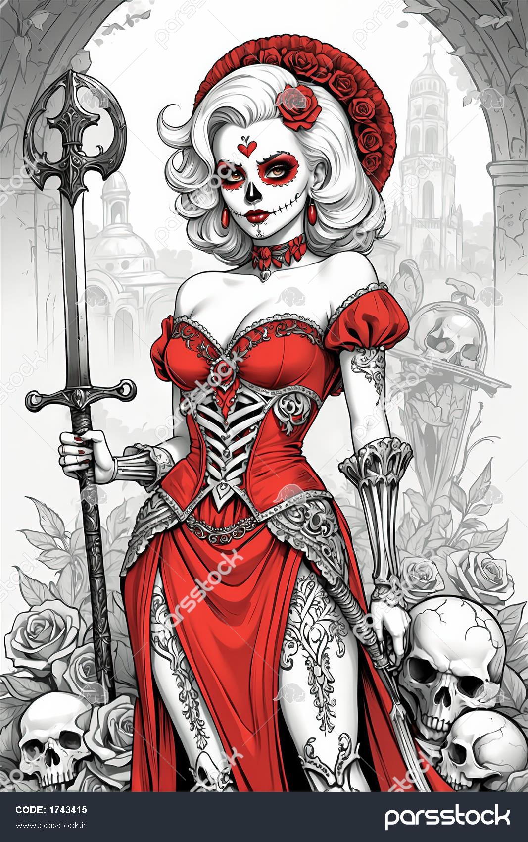 طرح جنگجوی مونرو با شمشیر، لباس کورستی و پسزمینه رزهای سرخ طرح مونرو جنگجو در طاق رومی با لباس کورستی و تاج گل رز طرح مرلین مونرو با لباس شب قرمز و آرایش اسکلتی ظریف تصویر اورجینال مرلین مونرو با کلاه لبهدار، شمشیر و لباس دکوراتیو قرمز پوستر مرلین مونرو با لباس شب قرمز، اسکلت و رز در طاق رومی طرح مرلین مونرو در هیبت ملکه کتینا با شمشیر و تاج جمجمه پرتره مونرو با خالکوبی اسکلت و رز، لباس بندی قرمز برای چاپ طرح مونرو با آرایش اسکلتی، زیورآلات و خالکوبی رز و شمشیر پرتره مونرو با خالکوبی اسکلت، لباس قرمز و تاج رزهای سرخ پوستر مرلین مونرو با آرایش اسکلتی، لباس قرمز و پسزمینه وینتیج نمایش همه