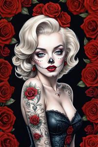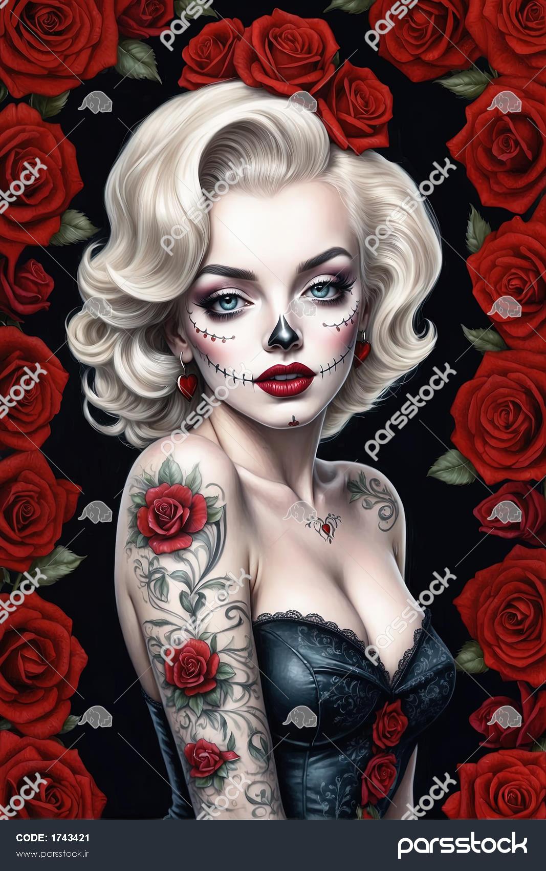 طرح گرافیکی مرلین مونرو با کلاه مکزیکی، زره و اسکلت روی شانه پرتره هنری مرلین مونرو با آرایش فانتزی و گلهای رز قرمز طرح تمامقد مونرو با لباس قرمز، شمشیر و اسکلت در پسزمینه کلیسا طرح مرلین مونرو در هیبت ملکه کتینا با شمشیر و تاج جمجمه مونرو در قاب آینهای ماه با تم گوتیک و آرایش روز مردگان تصویر مرلین مونرو در تم روز مردگان با خالکوبی قلب و رز پوستر مرلین مونرو با آرایش اسکلتی، لباس قرمز و پسزمینه وینتیج پرتره مرلین مونرو کاترینا با چوکر توری سیاه، آرایش کوکی و رزهای تیره پوستر هنری مرلین مونرو با آرایش اسکلتی و گل رز پرتره مونرو با خالکوبی اسکلت، لباس قرمز و تاج رزهای سرخ نمایش همه
