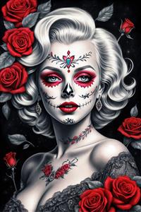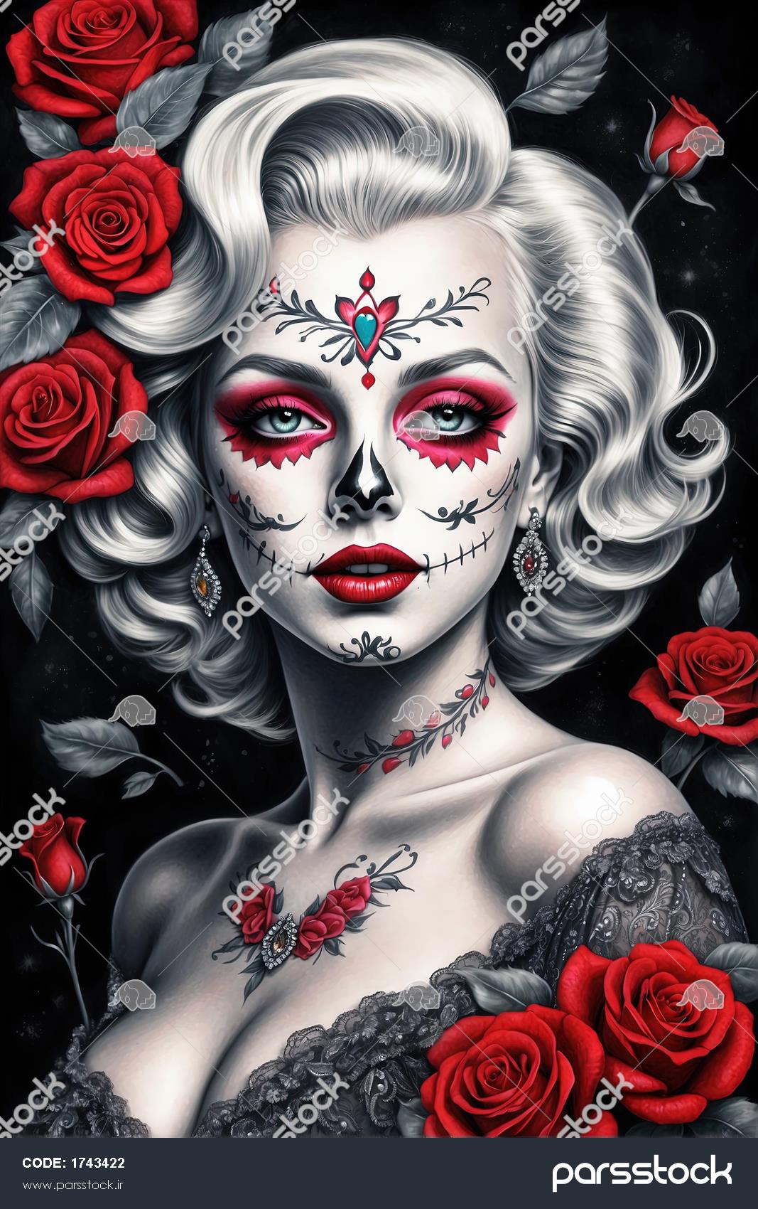 طرح مونرو با خالکوبی رز، آرایش اسکلتی و پسزمینه تیره عکس باکیفیت مونرو با آرایش کتینا و طرح قلبهای عاشقانه پوستر هنری مرلین مونرو با آرایش اسکلتی و گل رز پوستر مرلین مونرو با آرایش اسکلتی، لباس قرمز و پسزمینه وینتیج طرح مرلین مونرو با لباس شب قرمز و آرایش اسکلتی ظریف تصویر مرلین مونرو در تم روز مردگان با خالکوبی قلب و رز طرح مونرو با آرایش اسکلتی، زیورآلات و خالکوبی رز و شمشیر طرح گوتیک مرلین مونرو با کورست نقرهای، آرایش اسکلتی و رز پرتره مرلین مونرو با آرایش اسکلتی (کالاورا) و گلهای رز سرخ پرتره مونرو با خالکوبی اسکلت، لباس قرمز و تاج رزهای سرخ نمایش همه
