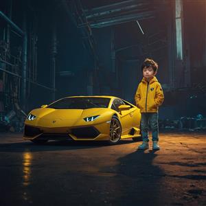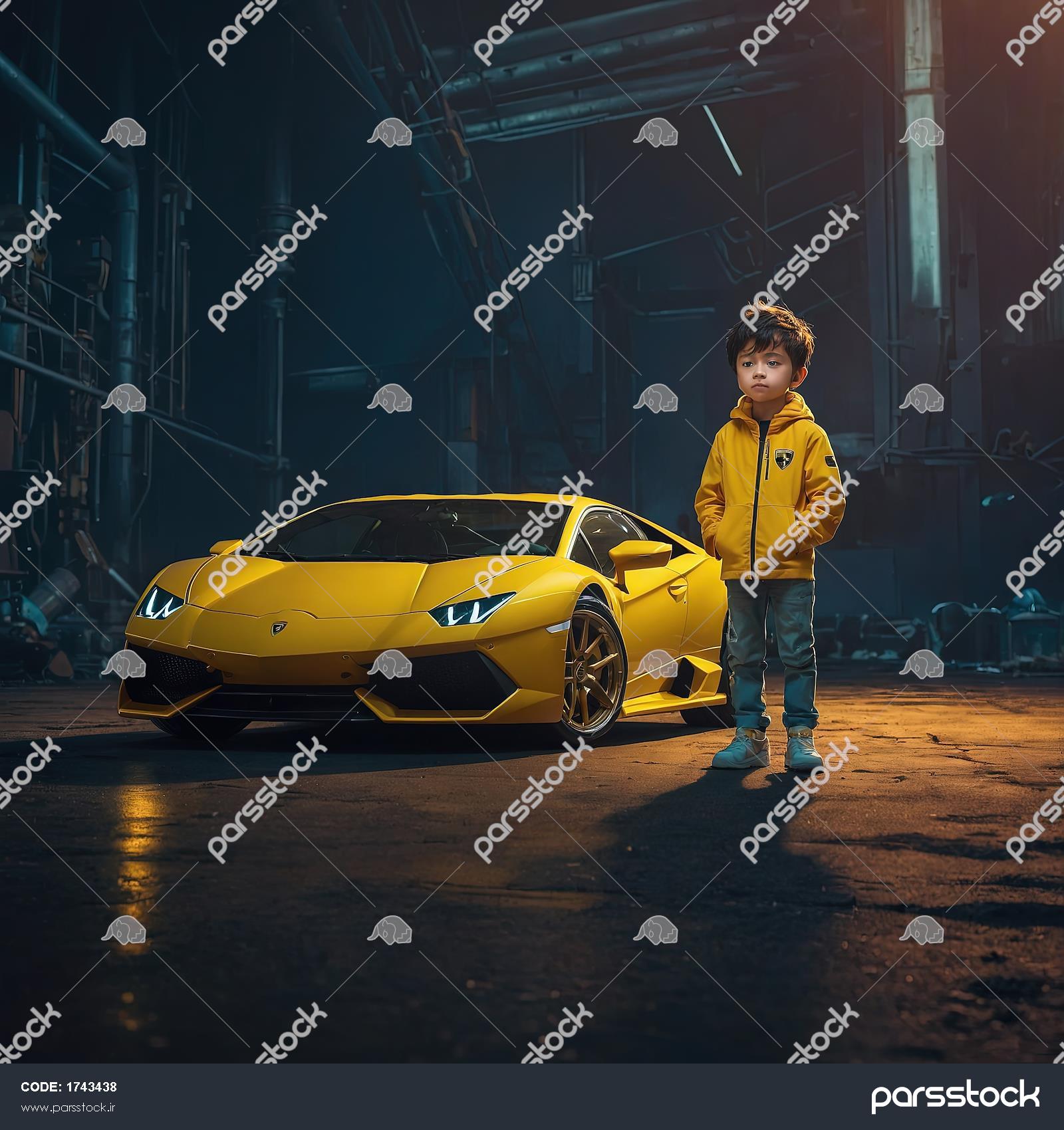 عکس پسر بچه و ماشین لامبورگینی زرد در گاراژ