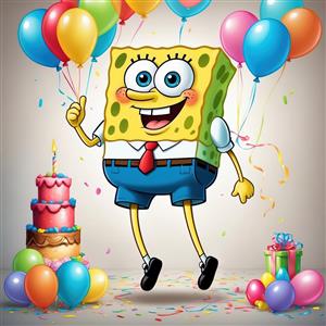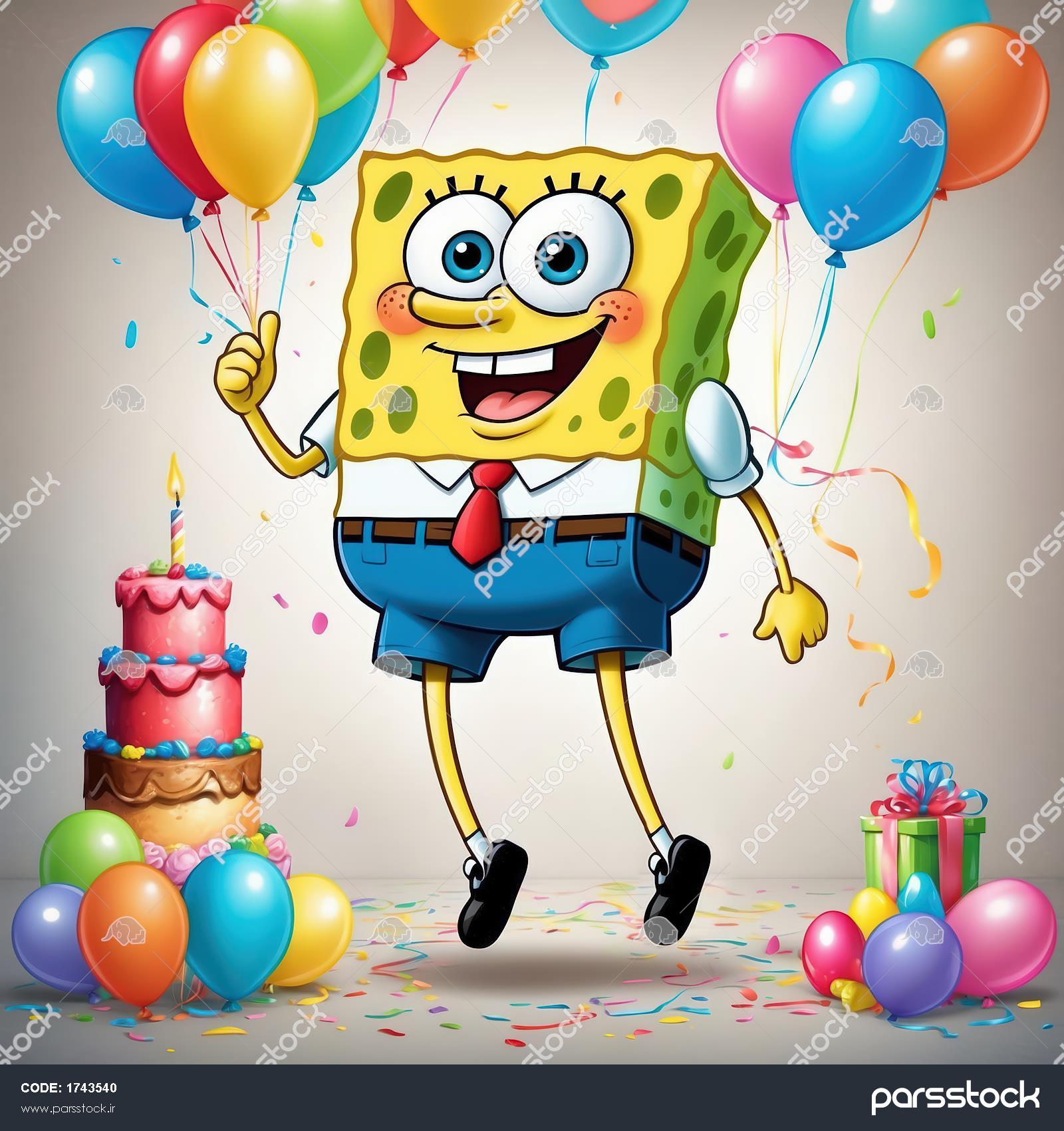 جشن تولد باب اسفنجی، بادکنک‌ها و کیک سه طبقه، تصویر با رزولوشن بالا برای چاپ پوستر
