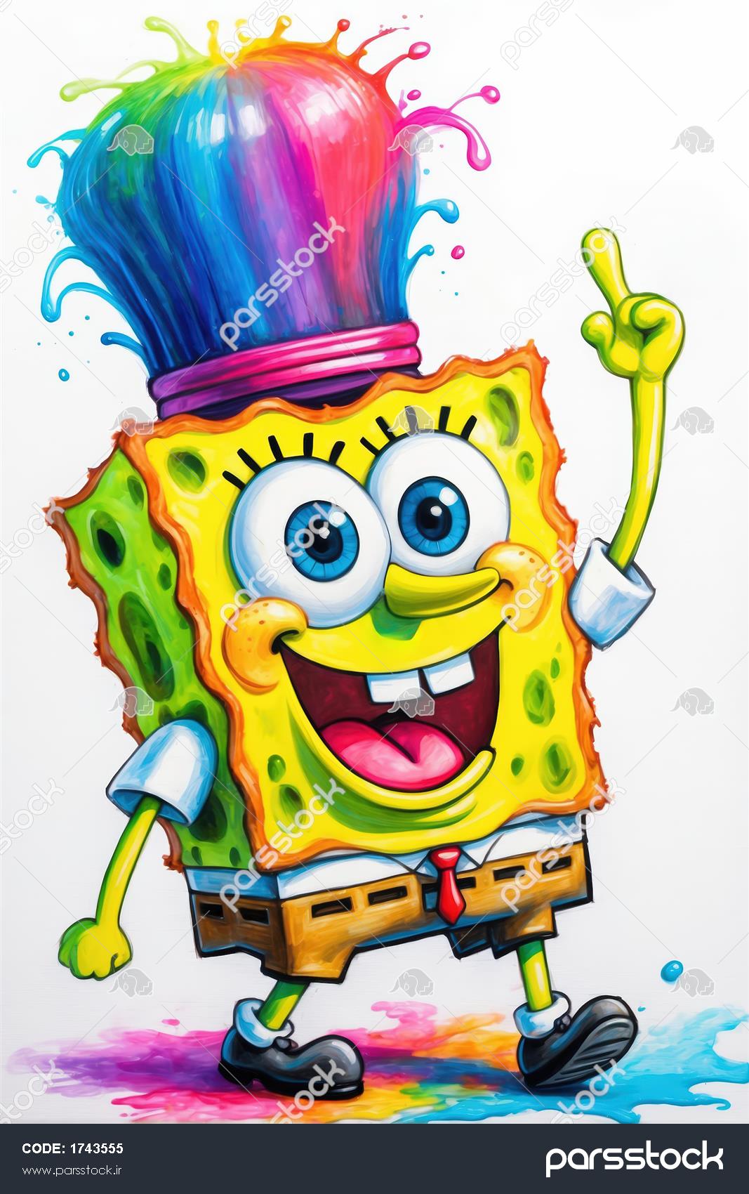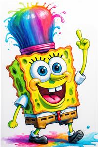 باب‌اسفنجی با رنگین‌کمان رنگی پاشیده‌شده روی سر – سبک پاپ آرت