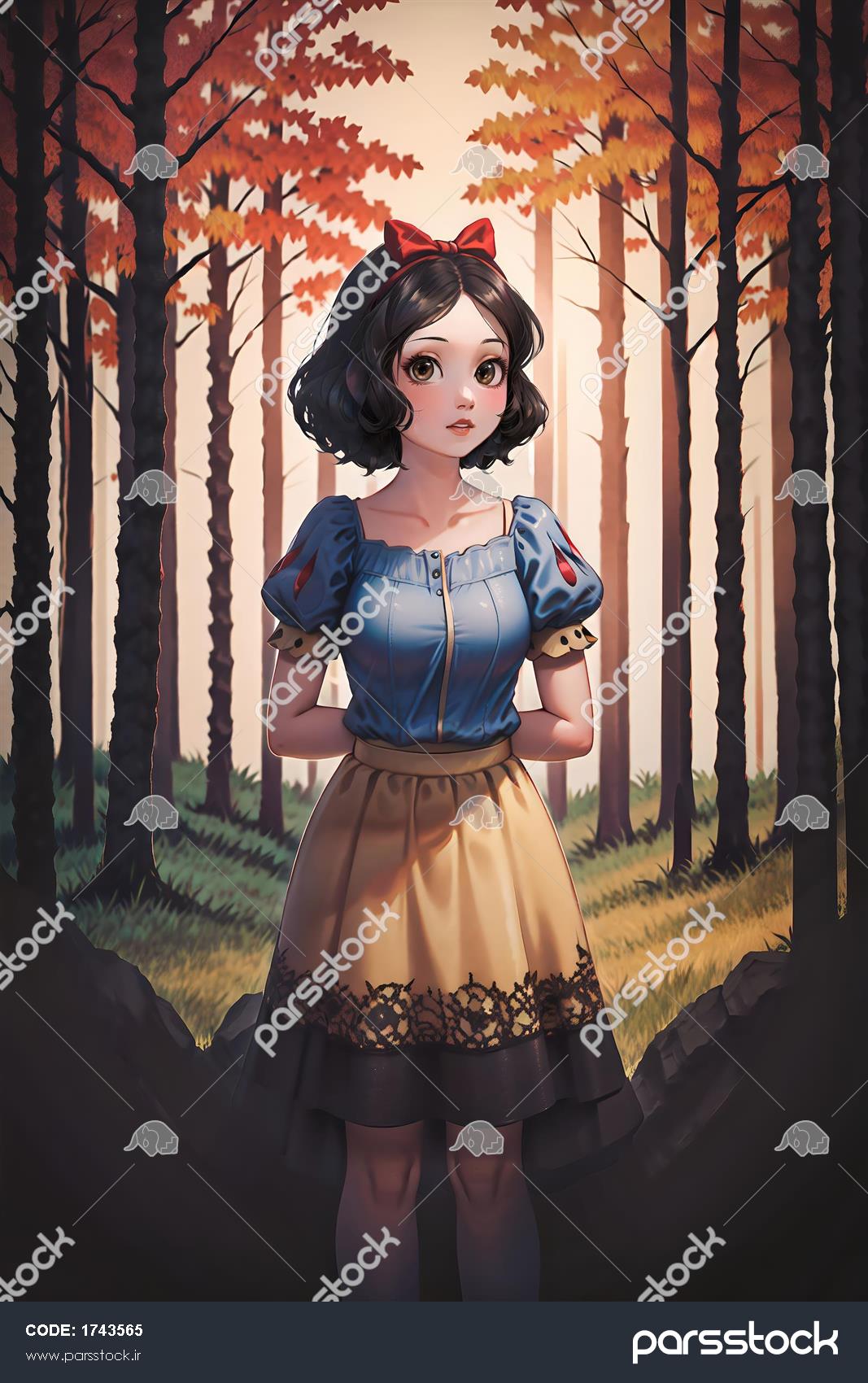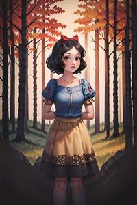 تصویر انیمه‌ای سفید برفی در جنگل پاییزی با رنگ‌های نارنجی و گرم