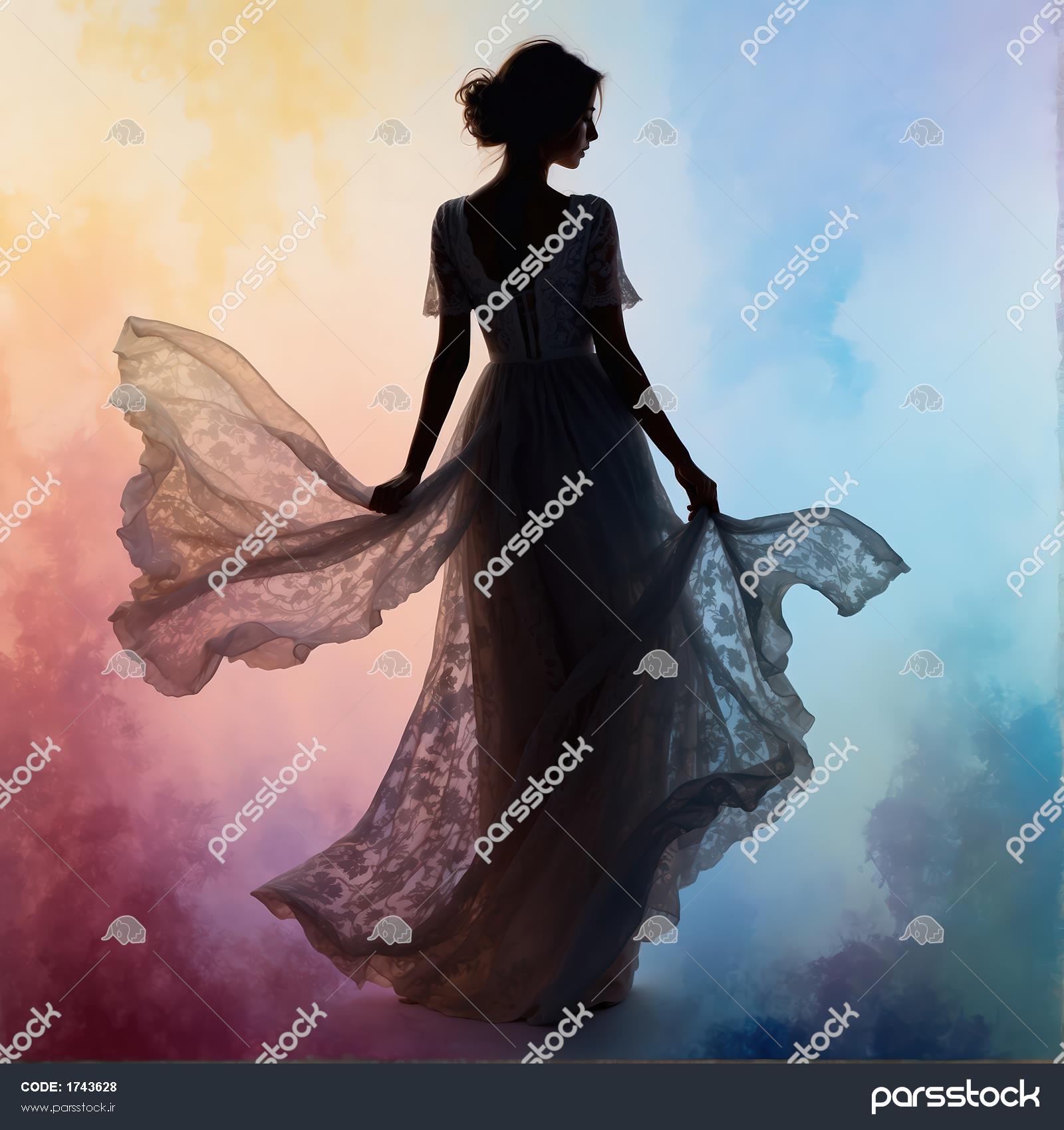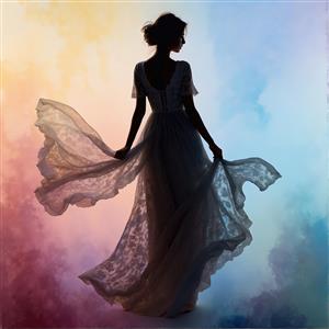 تصویر سورئال دختر در لباس بلند توری با پس‌زمینه آبرنگی ملایم