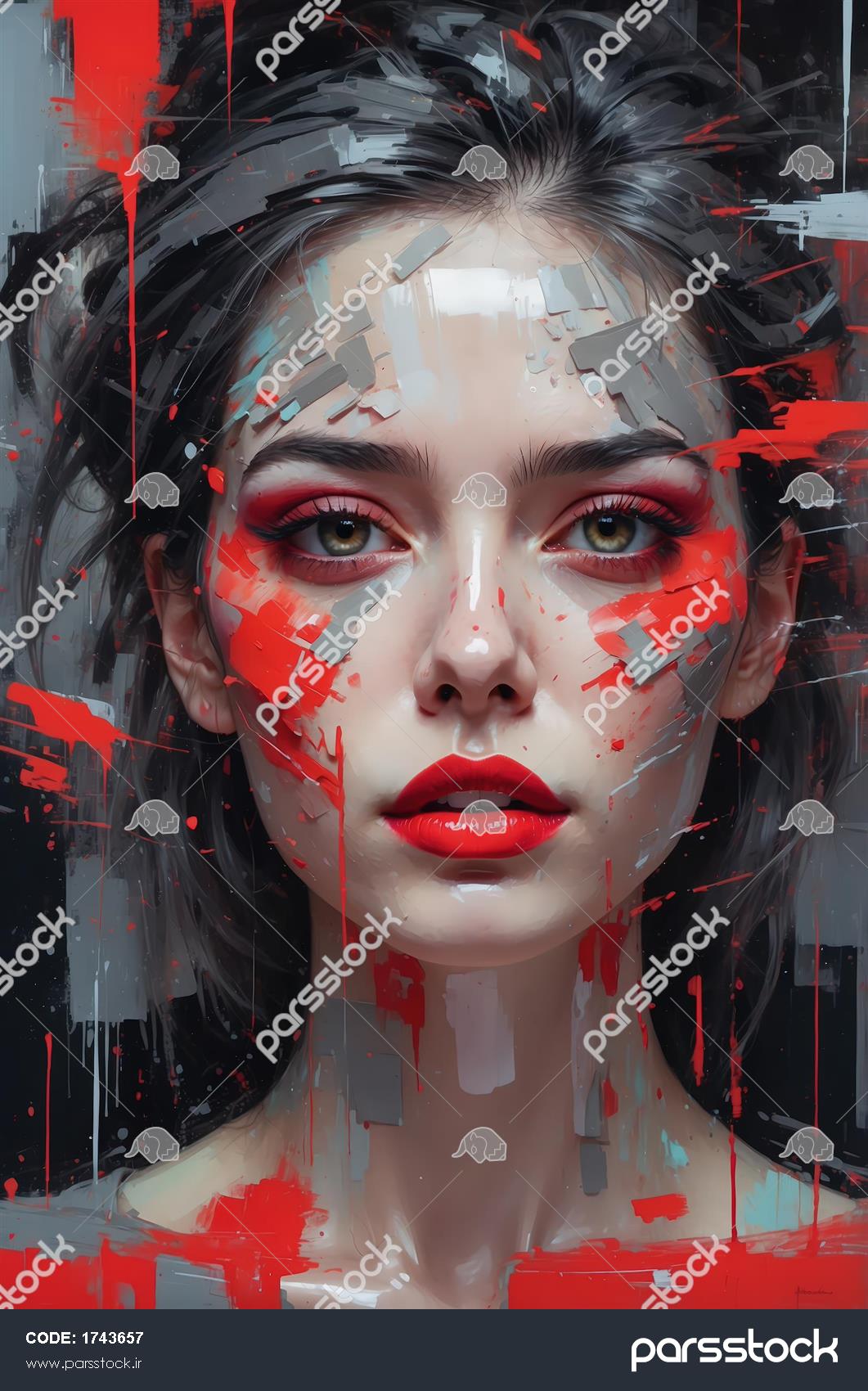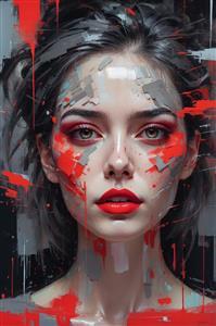 طرح چهره زن با پالت رنگی قرمز و خاکستری و ضربات قلم‌موی ضخیم