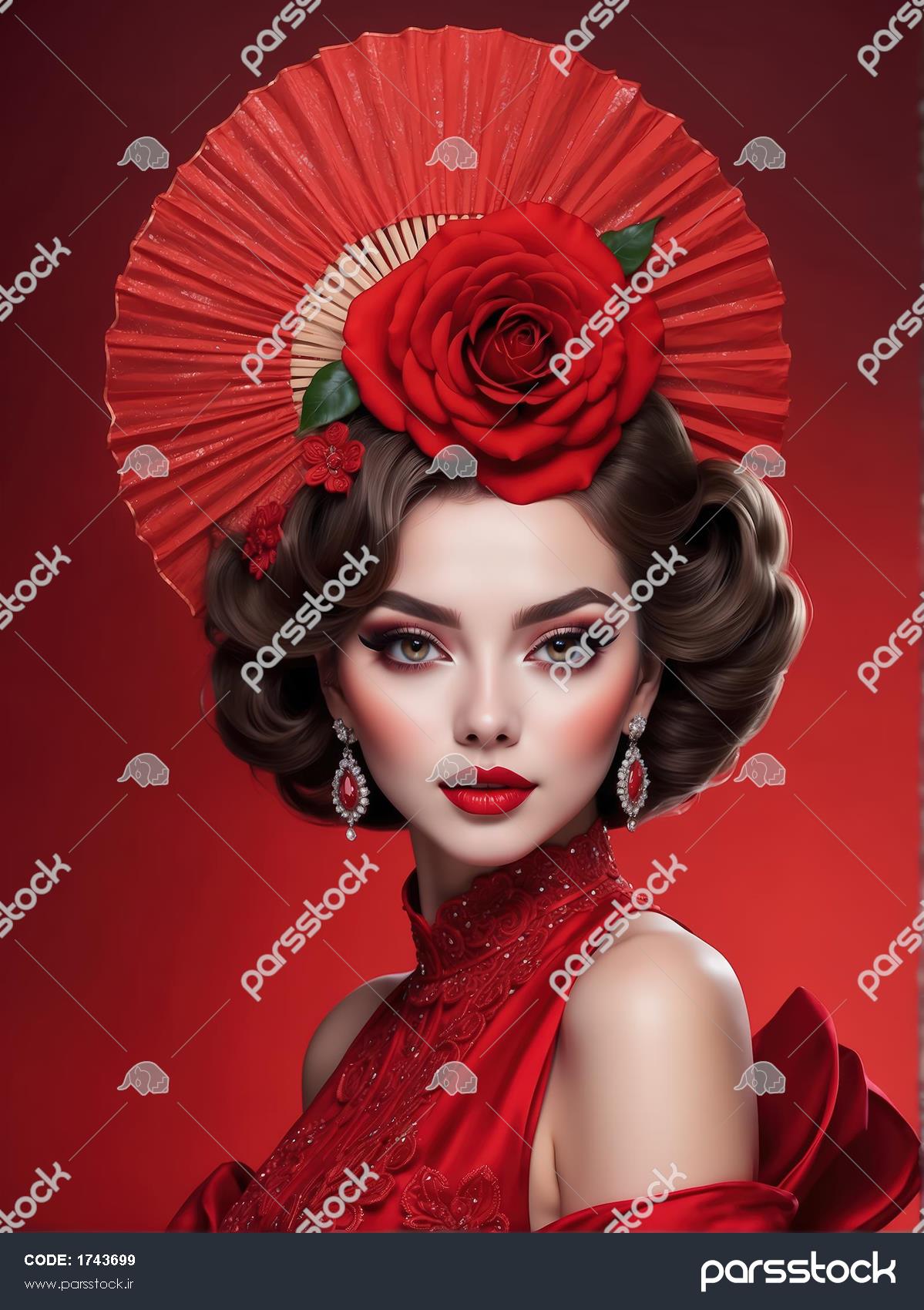 تصویر اورجینال زن با آرایش قرمز، گل رز و یقه ایستاده برای پوستر مد و فشن