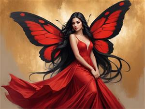پوستر زن پری‌مانند با بال پروانه قرمز و لباس مجلسی برای چاپ در ابعاد بزرگ