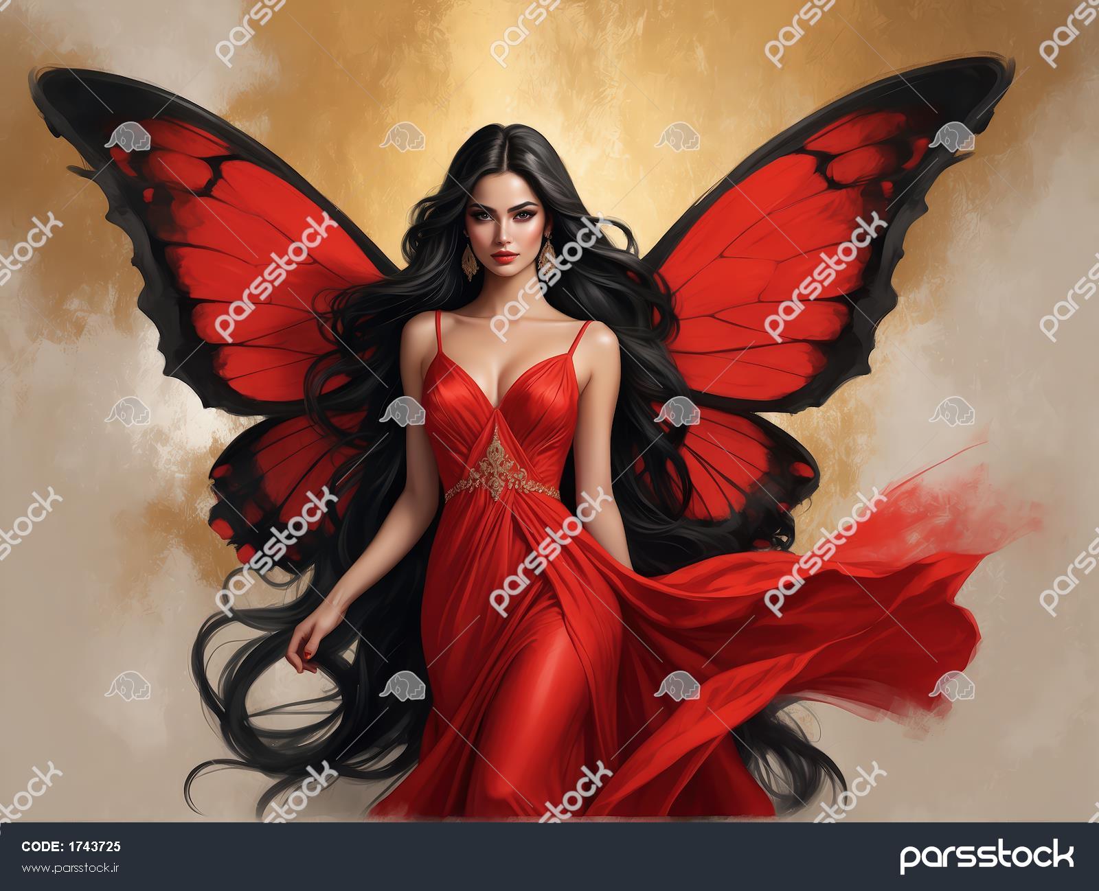 طرح دکوراتیو زن پری‌رو با بال‌های قرمز پروانه و موهای مواج برای چاپ در ابعاد بزرگ