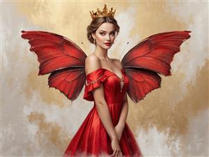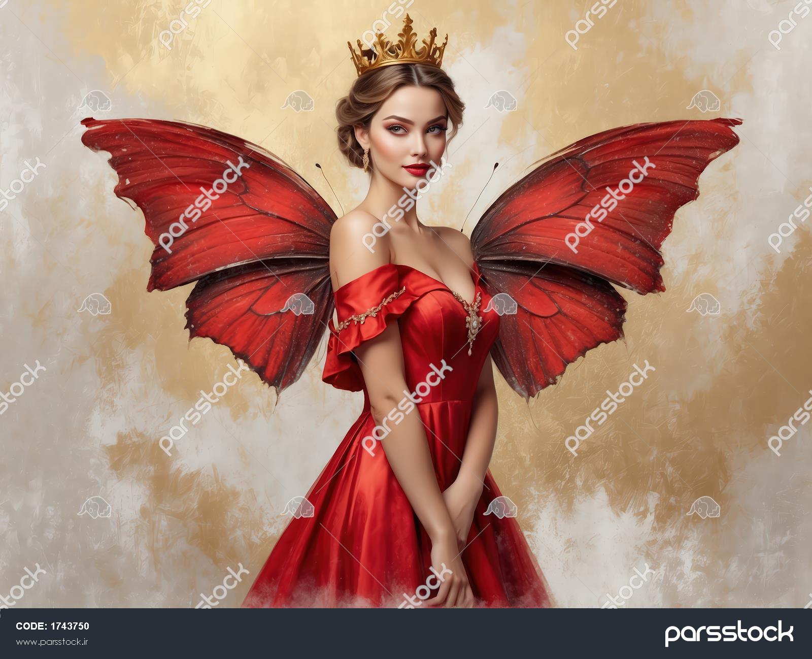 پرتره کلاسیک پری پروانه با موی جمع و لباس مجلسی قرمز، مناسب چاپ عریض