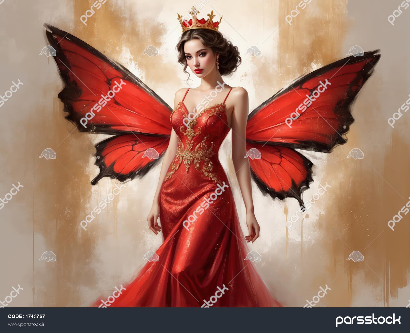 پری پروانه سرخپوش با تاج طلایی، مناسب پوستر و تابلو دکوراتیو بانوی پروانه با آستین توری و تاج، تصویر فاخر برای چاپ و تولید محصولات هنری ملکه زیبای پروانه با تاج طلایی و لباس شب قرمز، برای محصولات دکوری بانوی پروانه با موی بلند مشکی و هدبند پروانهای، مناسب تولید تابلو فانتزی تصویر اورجینال پری پروانه سرخپوش با شنل، مناسب تولید پوستر لاکچری تصویر شاهزاده خانم پروانه با پیراهن شب قرمز، مناسب چاپ تصویر استودیویی پری پروانه با پیراهن قرمز پولکدار و تاج، چاپ فاخر تصویر اورجینال پری پروانه سلطنتی در لباس فاخر قرمز، مناسب چاپ لوکس تصویر اورجینال پری پروانه در لباس شب ساتن قرمز، چاپ عریض با تم لاکچری تصویر شاهزاده خانم چیبی بالدار با تاج طلایی و لباس زرد، فانتزی و جذاب برای چاپ عریض و تولید پوستر و تابلو نمایش همه