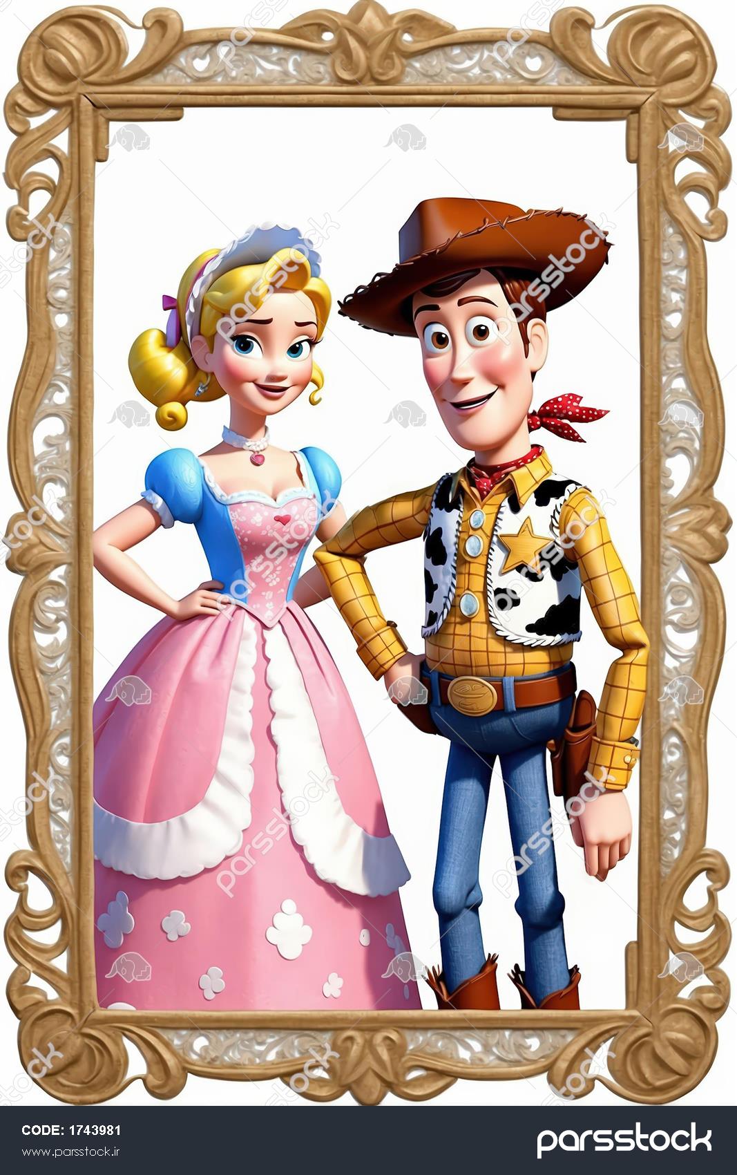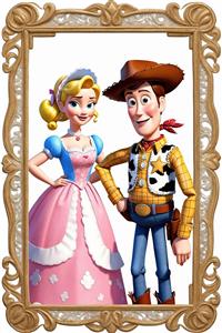 وودی و بو پیپ با لباس پرنسسی صورتی و آبی در قاب چوبی سلطنتی