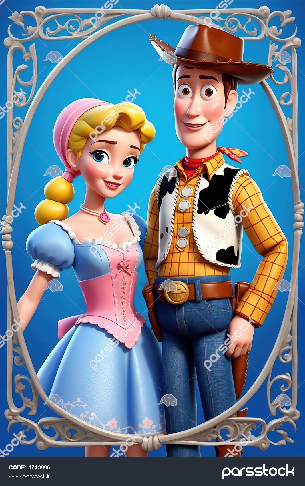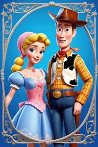 پرتره وودی و بو پیپ با لباس‌های متفاوت، قاب سفید تزئینی، طرح فانتزی باکیفیت
