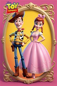 وودی و جسی در استایل پرنسسی و کابوی در قاب بیضی طلایی با پس‌زمینه زرد (عکس هنری سه‌بعدی برای چاپ عریض)