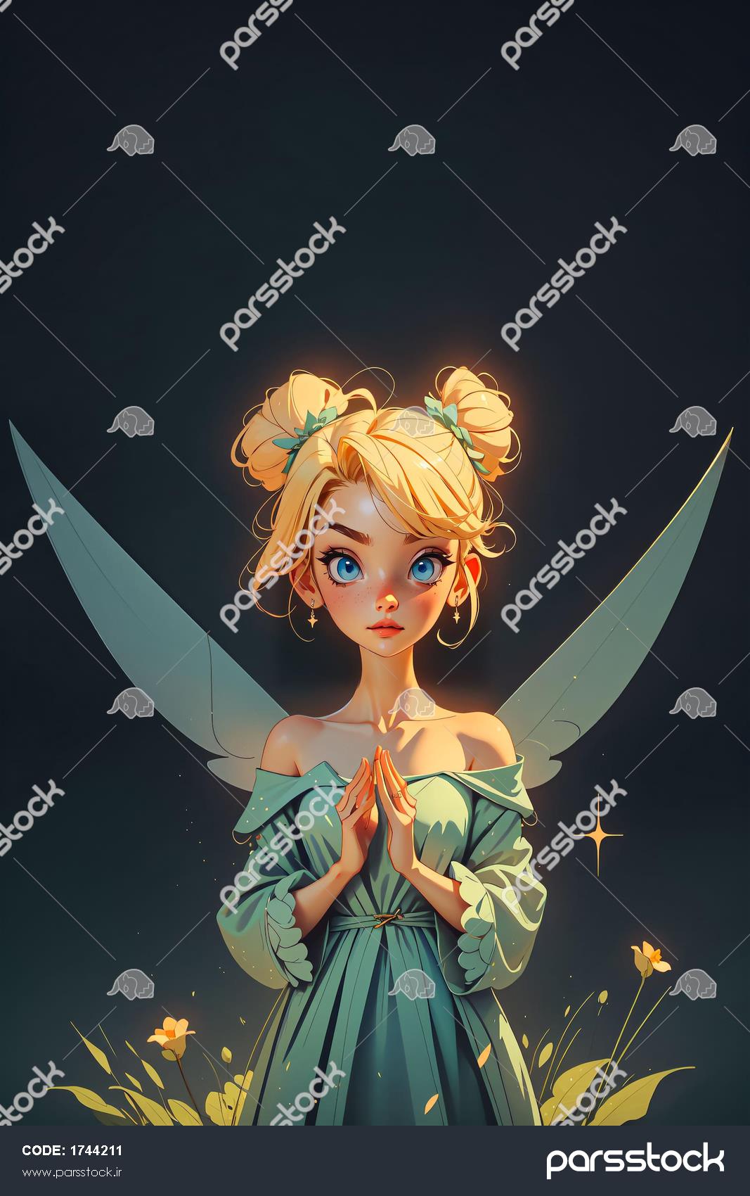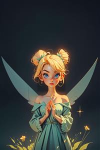 تینکربل ایستاده با لباس زمردی و موهای بان بان در پس زمینه تاریک