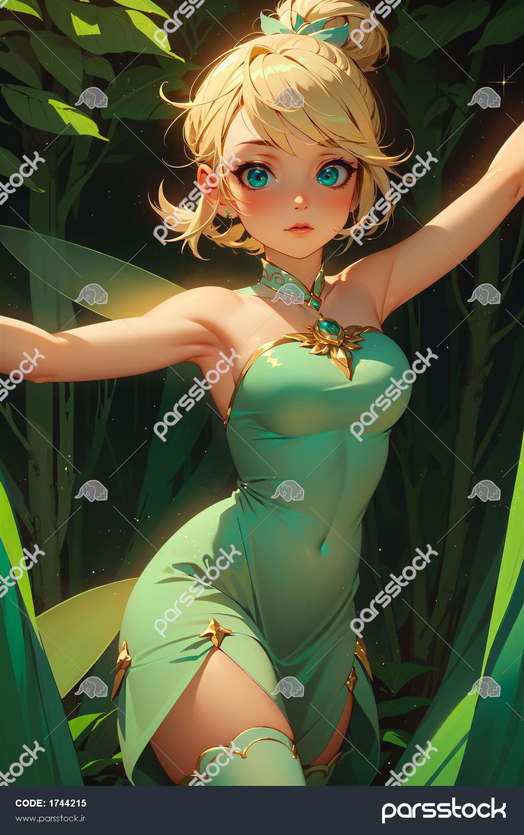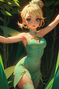 تینکربل رقاص با لباس سبز در میان برگ‌ها