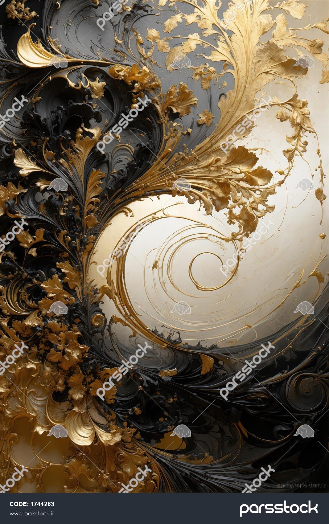 بافت آبرنگی طلایی و مشکی: نقش و نگار اسلیمی کلاسیک لوکس برای دکور