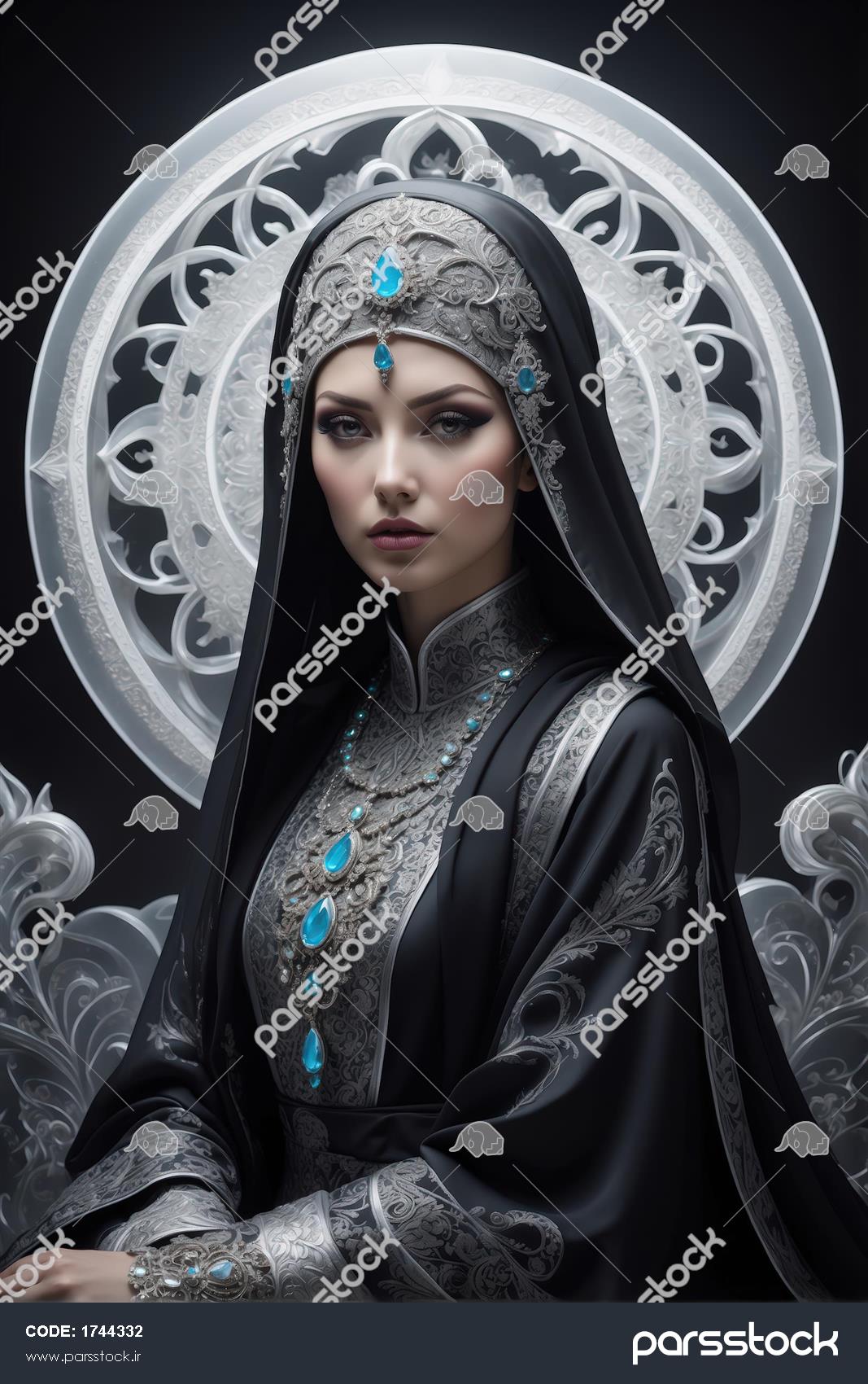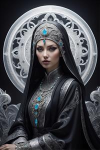 بانوی اشرافی مشکی‌پوش با جواهرات فیروزه‌ای و تاج درخشان (تم شرقی)