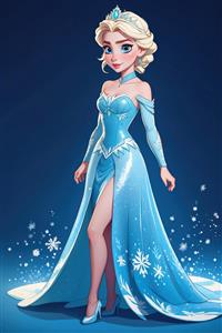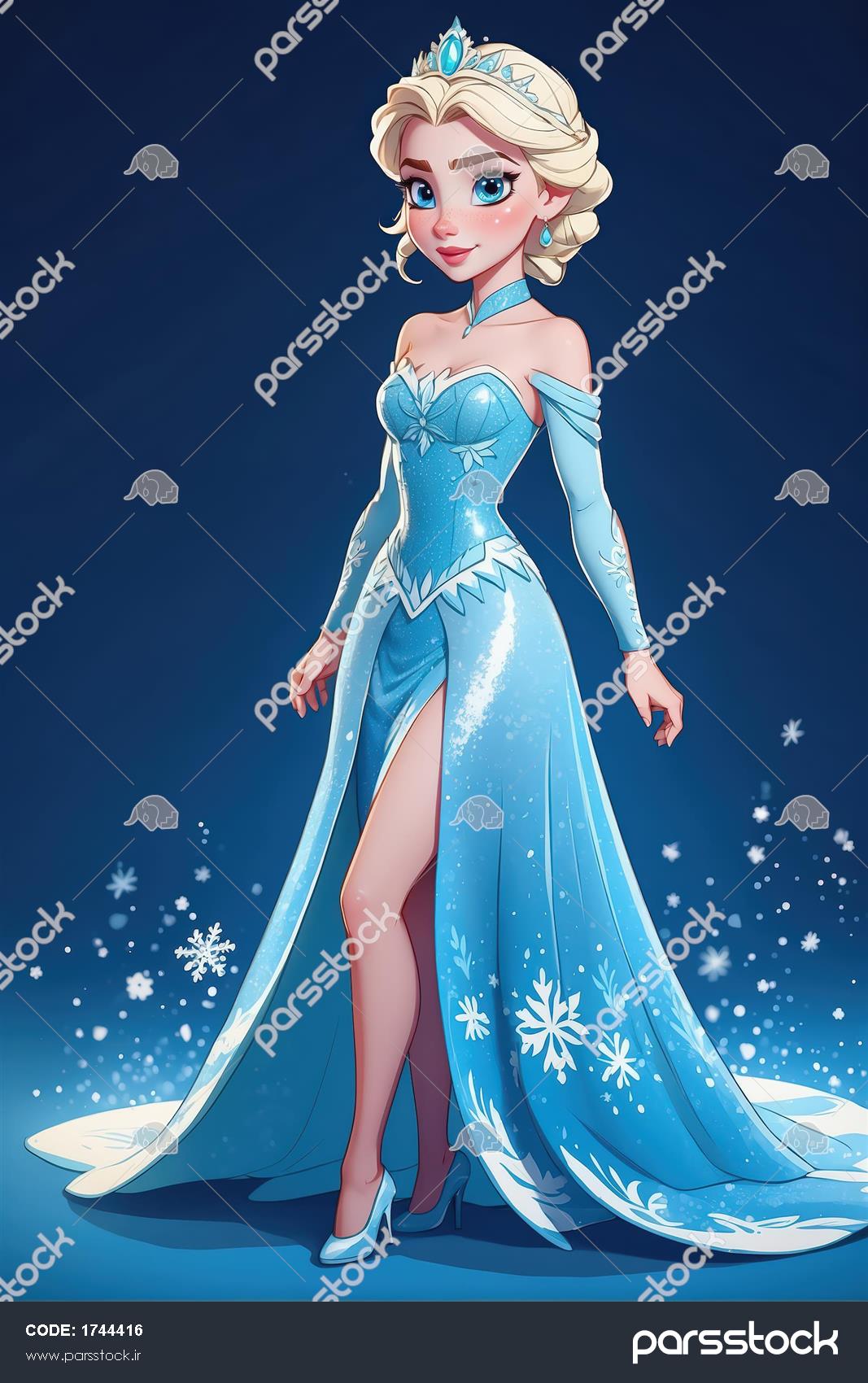 تصویر تمام‌قد السا با لباس آبی و چاک بلند در دهکده برفی (دکوراتیو)