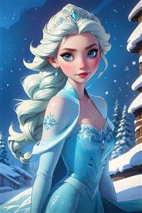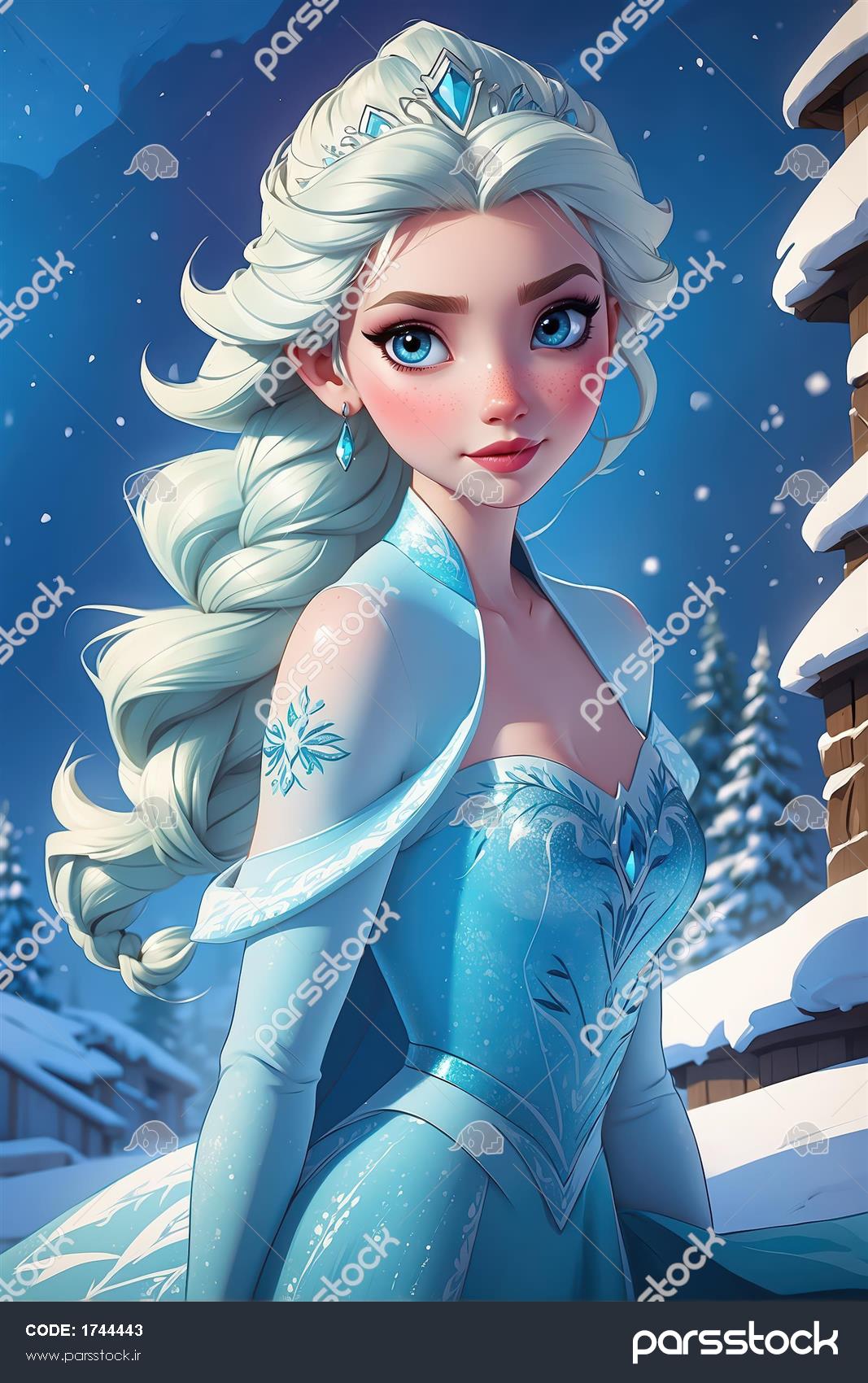 تصویر تمام‌قد السا در لباس آبی براق با بافت موی موج‌دار در زمستان