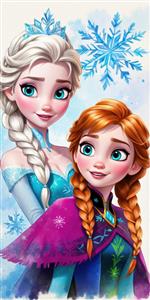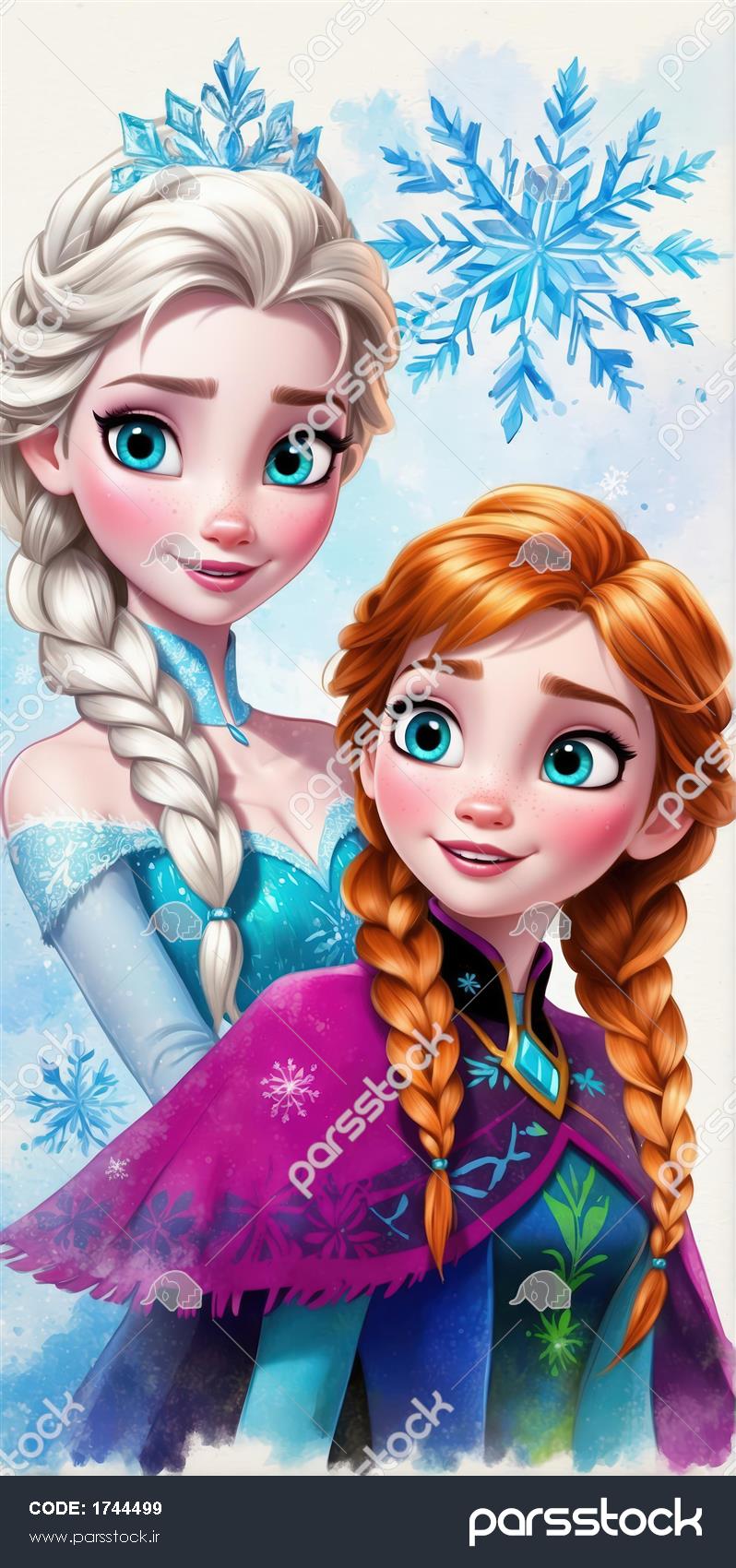 طرح آبرنگی السا و آنا با تاج و گل‌های برفی در پس‌زمینه روشن