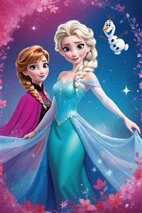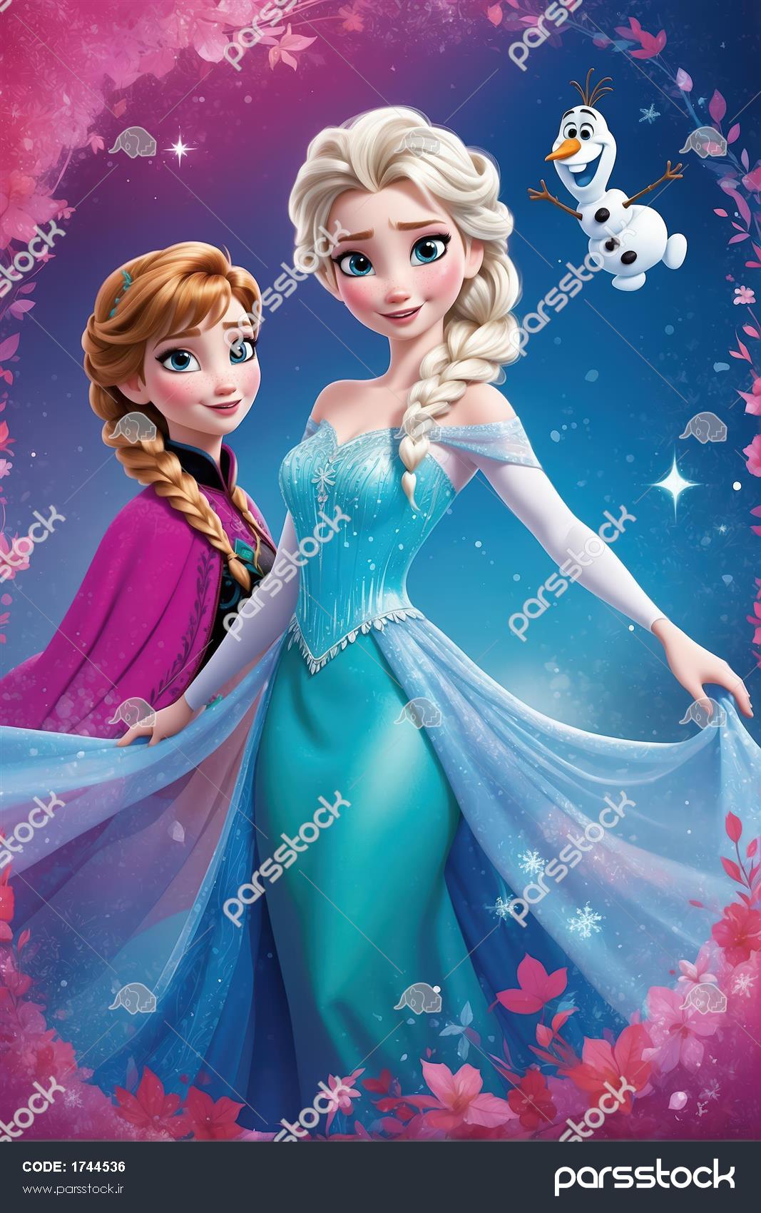 السا، آنا و اولاف با هم در قاب گل‌های صورتی، طرح نورانی و فانتزی، پوستر دکوراتیو