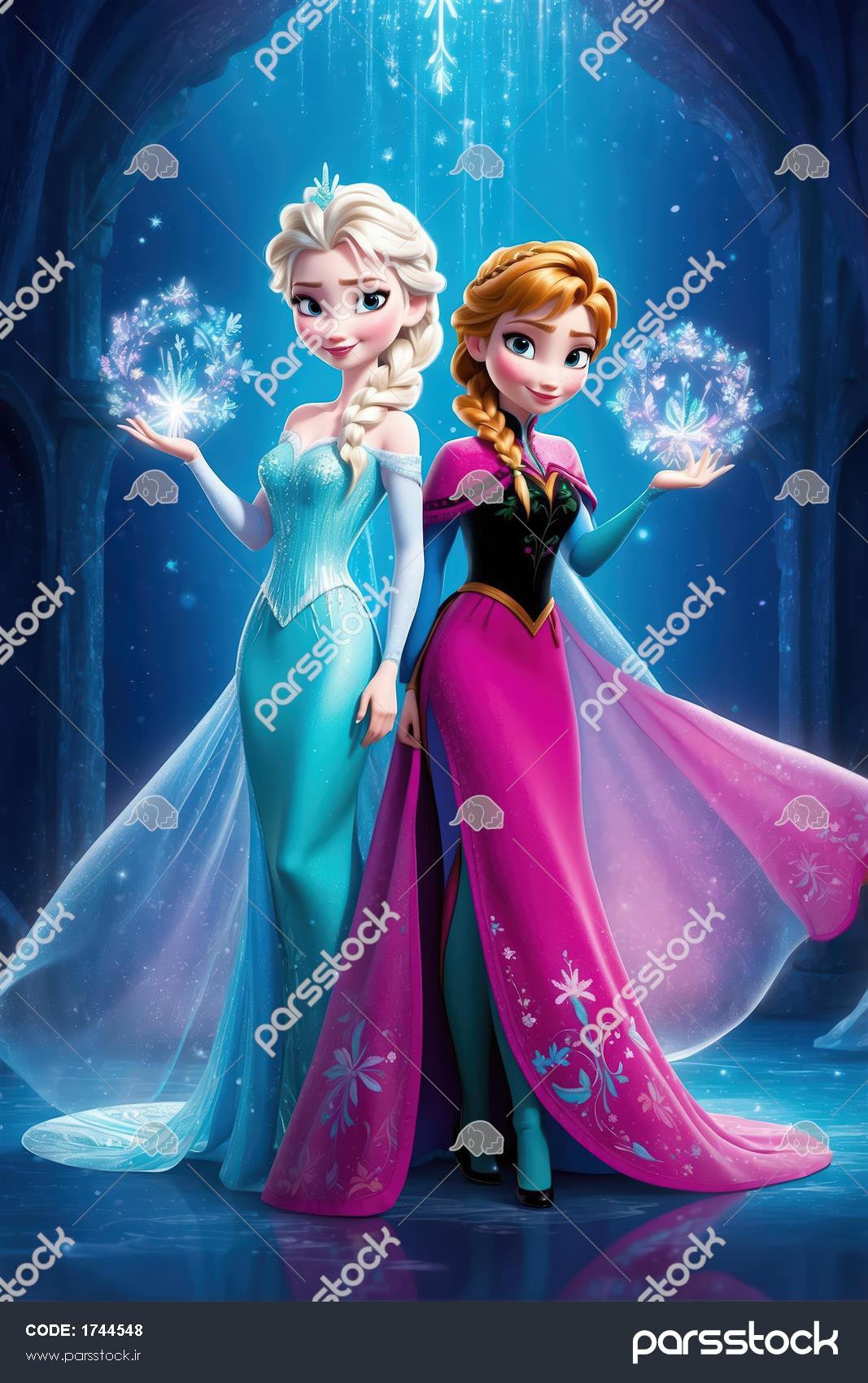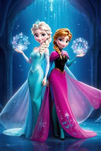 السا و آنا در لباس مجلسی آبی و سرخابی، با کریستال‌های برفی در پس‌زمینه درخشان آبی تیره