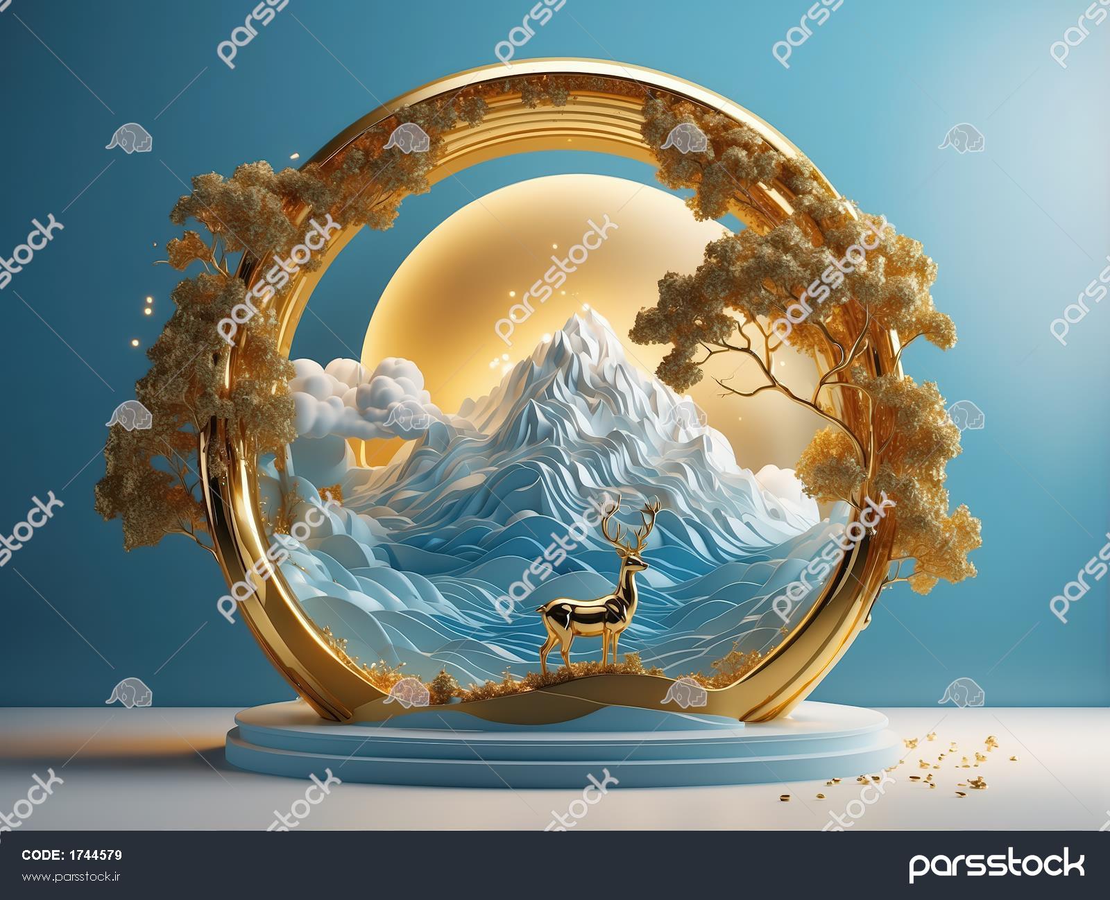 دکوراتیو گوزن طلایی در قاب رینگ، کوه برفی و درخت در روز آفتابی تندیس گوزن طلایی و درخت در قاب دایرهای با ماه زرین، تم آبی روشن رینگ طلایی با درخت با شکوه در مرکز، گوزن و کوهستان برفی در روز تندیس گوزن و درخت طلایی در قاب رینگ ماه کامل، دکوراسیون شب قاب طلایی با دو گوزن و ماه کامل در شب، طرح لوکس کوهستانی منظره فانتزی گوزن آبی و طلایی در کوهستان و جنگل مهتابی قاب طلایی و گوزن در شب کوهستان برفی، طرح لوکس دکوراتیو تصویر لوکس گوزن طلایی در برف و ماه آبی با تزیین درخت کاج تندیس گوزن طلایی در حلقه فلزی در شب کوهستان برفی طرح دکوراتیو گوزن طلایی در قاب دایرهای دره و ماه کامل مشاهده همه
