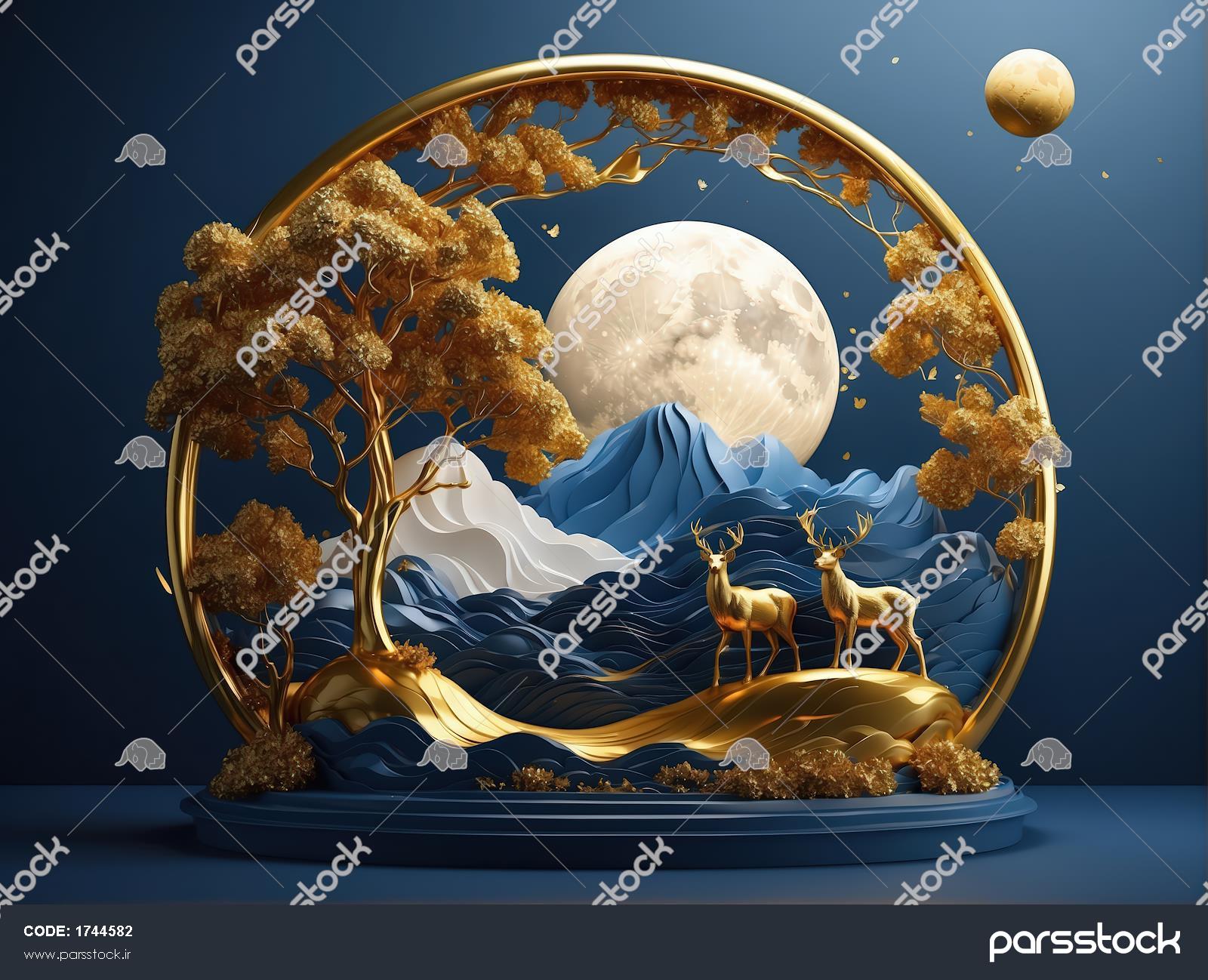 گوزن سفید و درختان طلایی در شب کوهستان و ماه سفید مجسمهای کوهستان سهبعدی و گوزن در حلقه طلایی، مهتاب و درختان طلایی طرح گوزن طلایی و خانوادهاش در جنگل اسرارآمیز، تابلو دکوراتیو با پسزمینه کوه و ماه طرح زن الهه با لباس کرم طلایی در قاب ماه و برگهای طلایی، پرتره دکوراتیو لوکس گوزن طلایی کوچک در قاب رینگ، موجهای آبی و کوه برفی، دکور روز گوزن طلایی بر روی تپههای آبی، منظره کوهستانی در شب با ماه کامل بزرگ گوزن طلایی در قاب دایرهای با ماه و کوههای آبی، تصویرسازی لوکس سه بعدی درخت بونسای طلایی و حلقه ماه کامل در منظره کوهستانی شب تندیس گوزن طلایی در حلقه فلزی در شب کوهستان برفی طرح گله گوزنها در کنار رودخانه با ماه کامل و جنگل طلایی، مناسب چاپ دکوراتیو نمایش همه