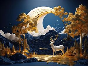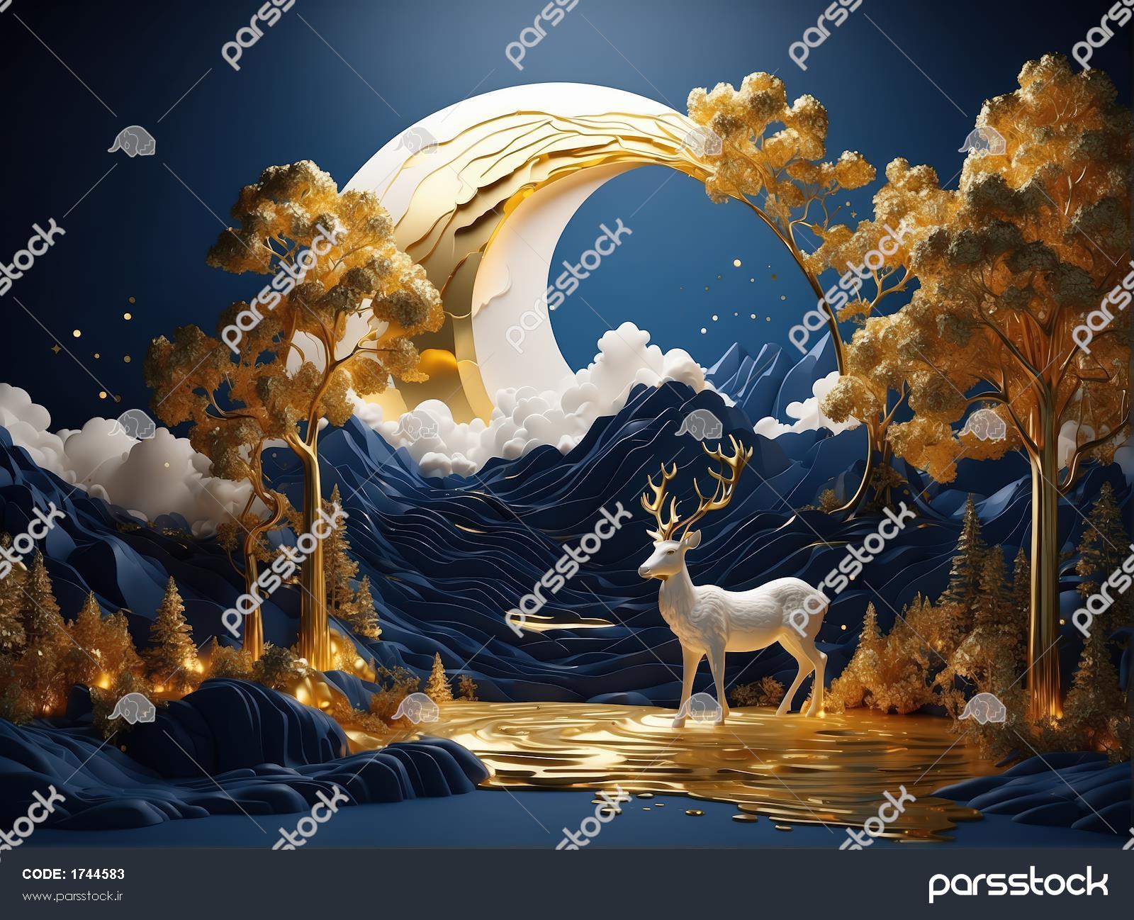 قاب طلایی و گوزن در شب کوهستان برفی، طرح لوکس دکوراتیو گوزن طلایی در مهتاب کامل، منظره شب کوهستان و رودخانه کوهستان سهبعدی و گوزن در حلقه طلایی، مهتاب و درختان طلایی درخت طلایی و گوزن زیر ماه کامل بر روی صخره، منظره شب و آبشار سه بعدی دو گوزن طلایی زیر ماه کامل و درختان، اثر هنری سه بعدی با قاب دایرهای در شب جلوه طلایی از گوزن در جنگل شب، رندر سه بعدی با ماه در قاب دایرهای منظره فانتزی گوزن آبی و طلایی در کوهستان و جنگل مهتابی گوزن طلایی و ماه بزرگ در گوی شیشهای با موجهای آبی، اثر سه بعدی چینی جدید گوزن طلایی زیر ماه کامل در گوی شیشهای، منظره کوه و آب با سبک سه بعدی لوکس گوزن طلایی در قاب دایرهای با ماه و کوههای آبی، تصویرسازی لوکس سه بعدی نمایش همه