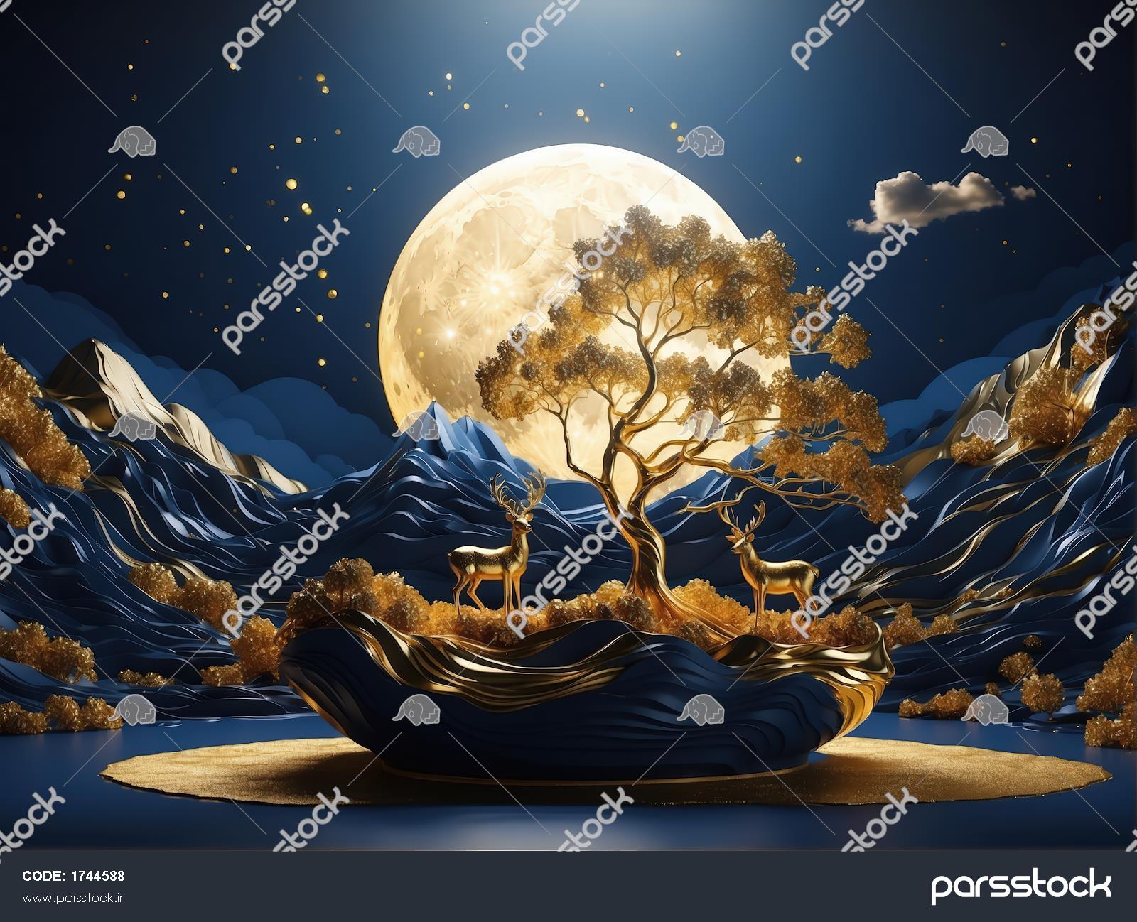 کوهستان سهبعدی و گوزن در حلقه طلایی، مهتاب و درختان طلایی منظره فانتزی گوزن آبی و طلایی در کوهستان و جنگل مهتابی گوزن طلایی بر روی تپههای آبی، منظره کوهستانی در شب با ماه کامل بزرگ درخت طلایی و گوزن زیر ماه کامل بر روی صخره، منظره شب و آبشار سه بعدی گوزن طلایی در مهتاب کامل، منظره شب کوهستان و رودخانه تندیس گوزن طلایی در حلقه فلزی در شب کوهستان برفی درخت زندگی طلایی زیر ماه کامل در میان کوهها، منظره شبانه با گوزن تندیس گوزن طلایی و درخت در قاب دایرهای با ماه زرین، تم آبی روشن گوزن طلایی کوچک در قاب رینگ، موجهای آبی و کوه برفی، دکور روز قاب طلایی و گوزن در شب کوهستان برفی، طرح لوکس دکوراتیو نمایش همه