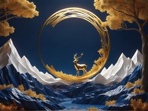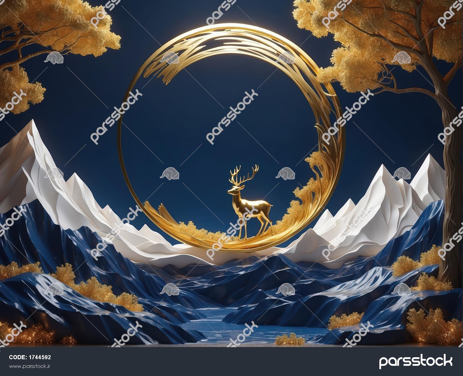 قاب طلایی و گوزن در شب کوهستان برفی، طرح لوکس دکوراتیو