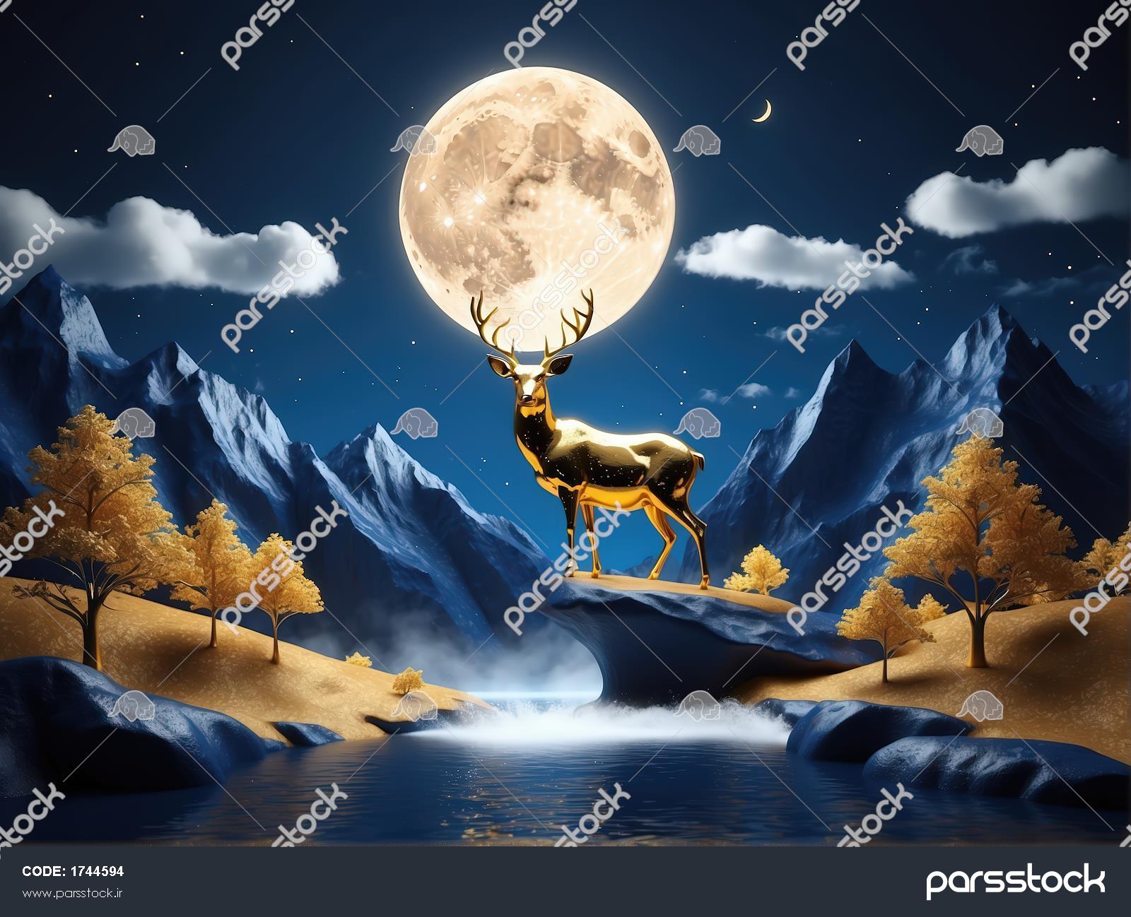 درخت طلایی و دو گوزن در جزیره فانتزی زیر نور ماه کامل مینیاتور گوزن طلایی و درخت بر روی موجها با ماه بزرگ، تم شبانه گوزن طلایی بر روی تپههای آبی، منظره کوهستانی در شب با ماه کامل بزرگ منظره شبانه جنگل با رودخانه و ماه کامل، طبیعت آرام در نور مهتابی، تصویرسازی رودخانه در شب قاب طلایی با دو گوزن و ماه کامل در شب، طرح لوکس کوهستانی تصویر لوکس گوزن طلایی در برف و ماه آبی با تزیین درخت کاج گوزن طلایی زیر ماه کامل در گوی شیشهای، منظره کوه و آب با سبک سه بعدی لوکس درخت زندگی طلایی زیر ماه کامل در میان کوهها، منظره شبانه با گوزن تندیس گوزن طلایی و درخت در قاب دایرهای با ماه زرین، تم آبی روشن گوزن طلایی کوچک در قاب رینگ، موجهای آبی و کوه برفی، دکور روز نمایش همه