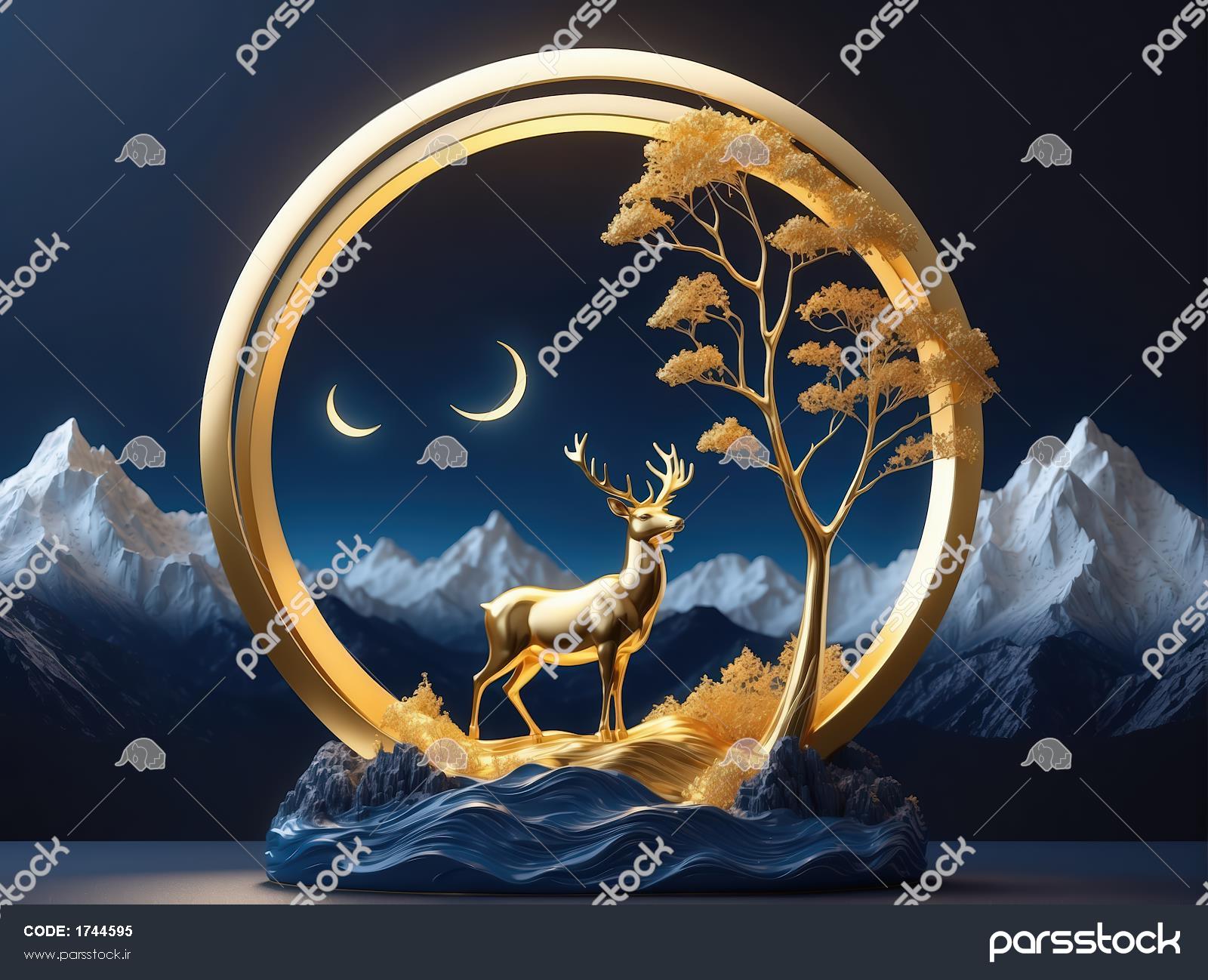 قاب طلایی با دو گوزن و ماه کامل در شب، طرح لوکس کوهستانی تندیس گوزن طلایی و درخت در قاب دایرهای با ماه زرین، تم آبی روشن دکوراتیو گوزن طلایی در قاب رینگ، کوه برفی و درخت در روز آفتابی مینیاتور گوزن طلایی و درخت بر روی موجها با ماه بزرگ، تم شبانه درخت طلایی و دو گوزن در جزیره فانتزی زیر نور ماه کامل طرح دکوراتیو گوزن طلایی در قاب دایرهای دره و ماه کامل رینگ طلایی با درخت با شکوه در مرکز، گوزن و کوهستان برفی در روز گوزن طلایی بر روی تپههای آبی، منظره کوهستانی در شب با ماه کامل بزرگ درخت طلایی و گوزن زیر ماه کامل بر روی صخره، منظره شب و آبشار سه بعدی طرح سهبعدی زوج در حلقه طلایی و درخت مینیاتوری برای چاپ سالگرد نمایش همه
