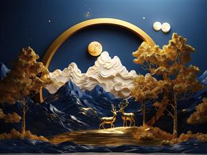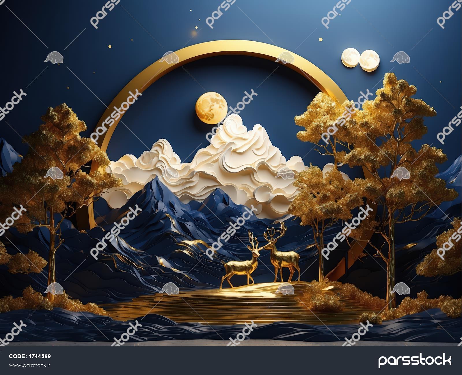 دو گوزن طلایی در مهتاب با کوه‌های برجسته و قاب طلایی، رندر لوکس
