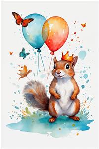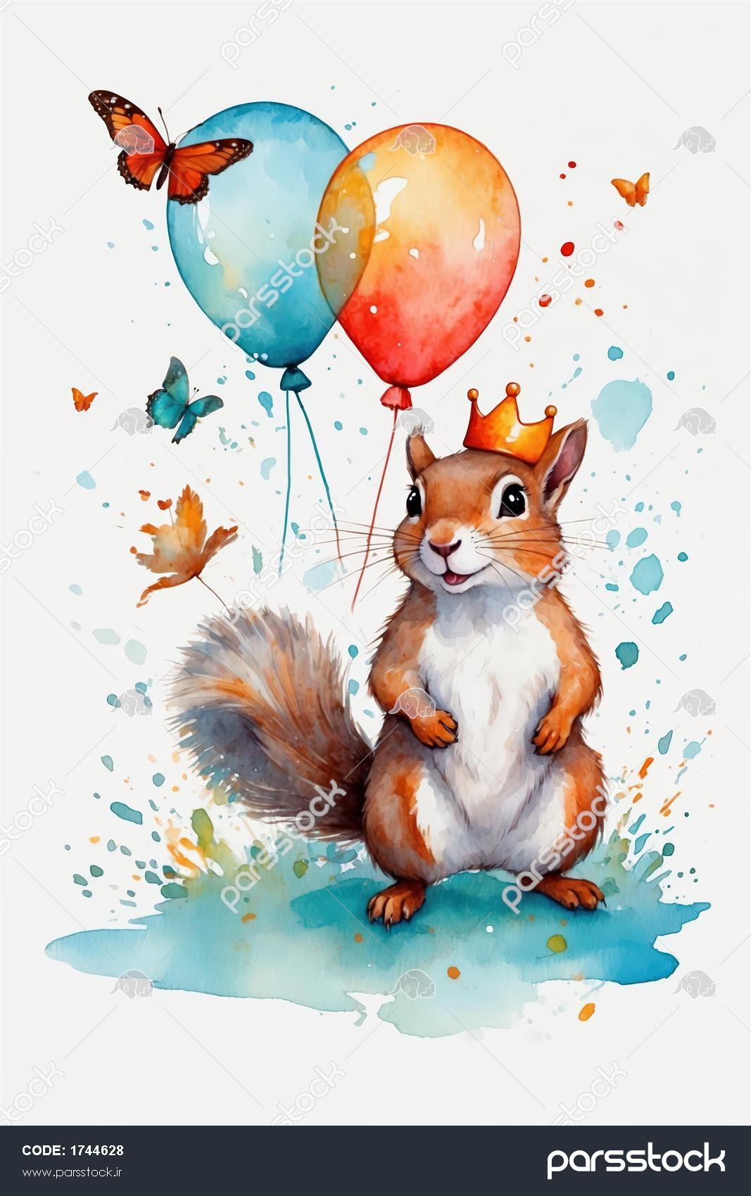 سنجاب تاج‌دار با بادکنک‌های آبی و نارنجی، تصویرسازی جشن تولد کودکانه سبک آبرنگ