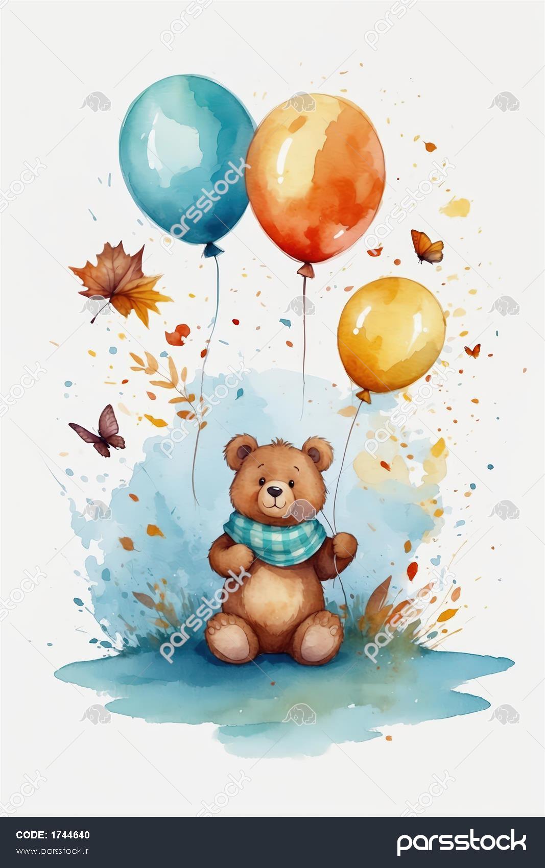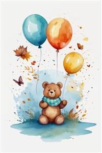 تصویر آبرنگی خرس تدی با بادکنک‌ها و شال آبی؛ تم پاییزی (برگ‌ها و رنگ پاشیده)
