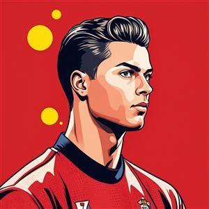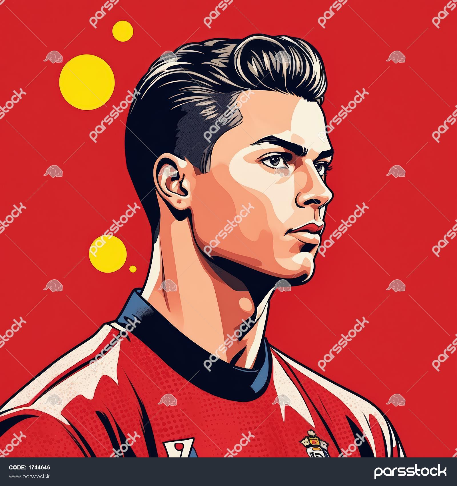 تابلو رونالدو نیم‌رخ با پیراهن قرمز و پس‌زمینه قرمز ساده و دایره‌های زرد